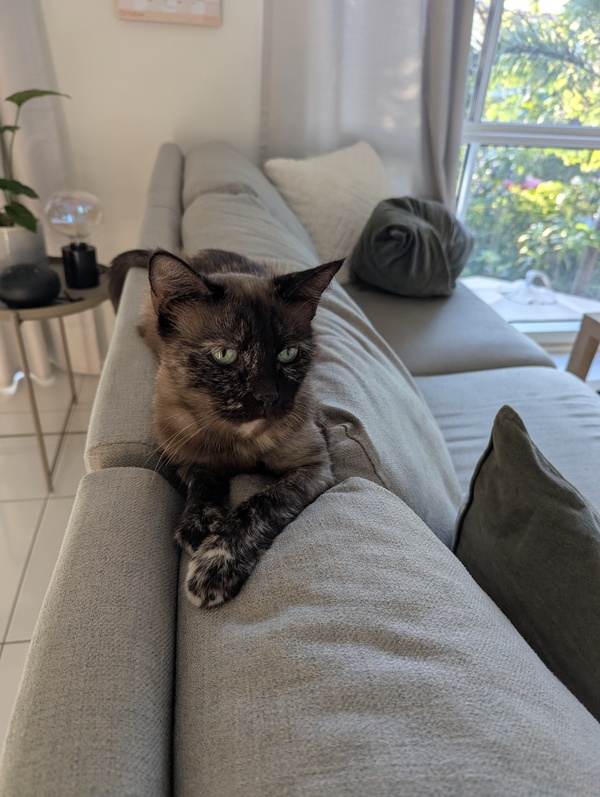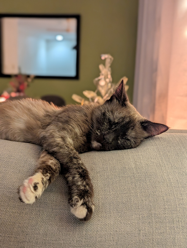 Hi, I'm Sheeba. I'm a young, shy cat who loves cuddles. My days are quiet and sweet, filled with gentle naps and soft purrs. I'm on a strict diet to keep me healthy, so I need someone who can help me with that. I might take a little while to come out of my shell, but once I do, I promise to be the most loving companion. If you're looking for a calm, affectionate friend, I'm the perfect cat for you. Let's make a cozy home together!