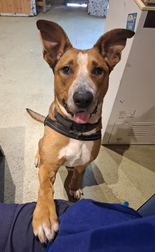While Frisbee has lots of love to give, she's still learning the ropes when it comes to the world around her. She is very passionate about treats, and benefits most from a consistent routine and patient guidance! Frisbee is best suited to an adults-only home with no other pets and a large secure yard. Her new family must be experienced, confident, and physically capable of managing her 30kg size and boisterous energy. They will need to be committed to continuing her training, helping her build calm behaviours and navigate the world in a positive way.