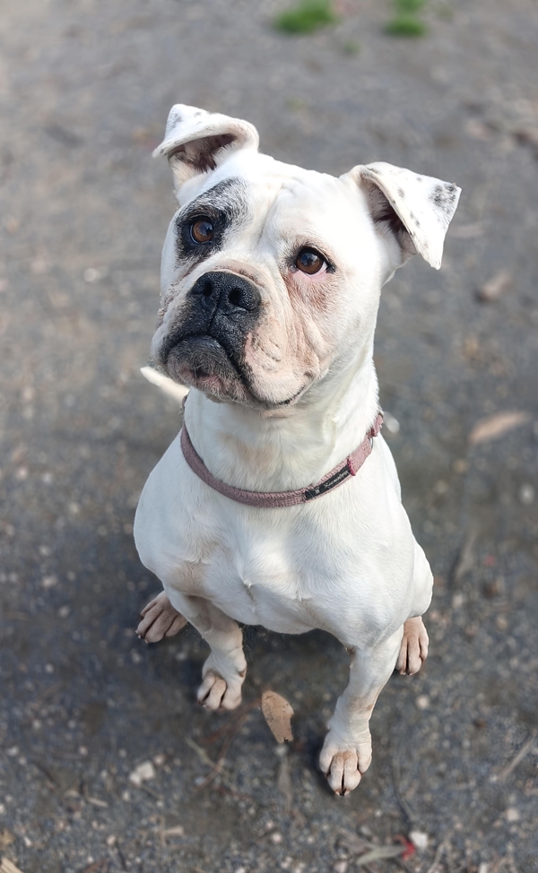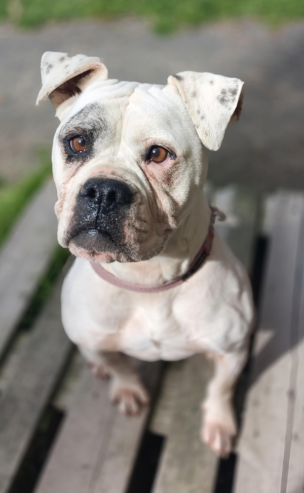 Winnie is a sweet soul who craves companionship and will become stressed if left alone for long periods. She's looking for a home where she'll be cherished and included in daily life. Her goofy charm, resilience, and affectionate personality make her a perfect addition to a loving family. Winnie loves her walks and has quite a bit of strength, so she'll do best with someone comfortable managing a strong dog on lead. If you're ready to welcome a chunky girl with a beautiful nature into your life, Winnie is waiting to meet you.