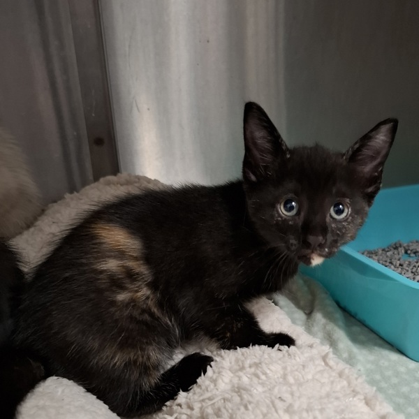 This beautiful little tortie girl is Banksy - named after the iconic street artist from her "art litter." With her stunning patchwork coat and a perfectly placed white spot on her chin, she's a living masterpiece in her own right.