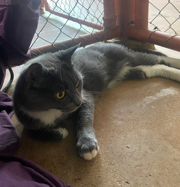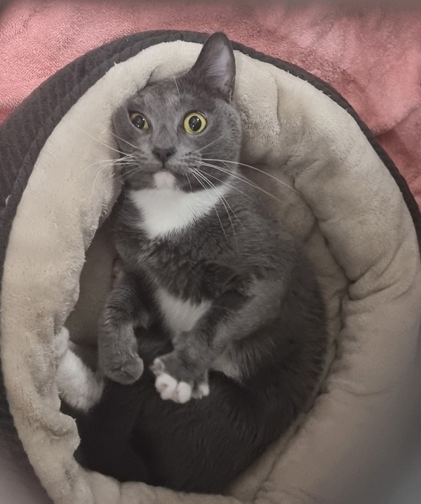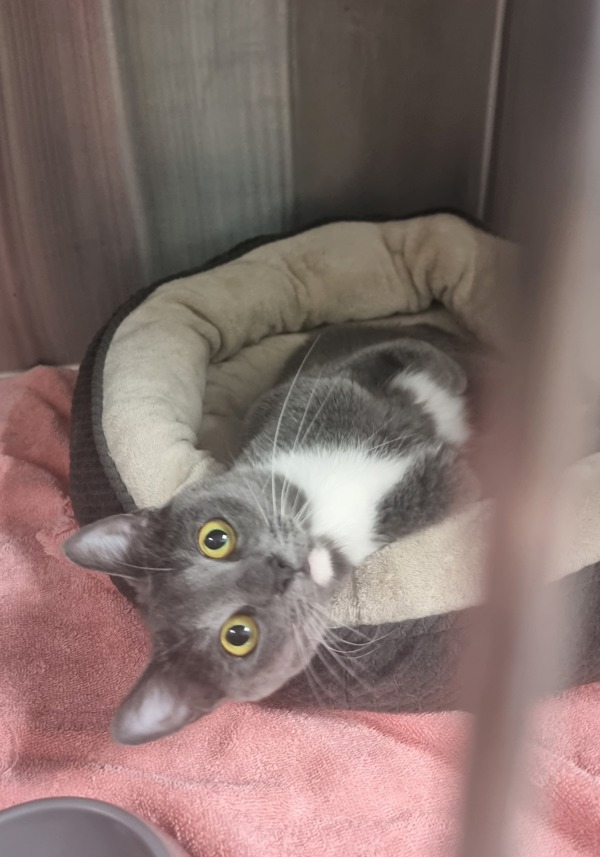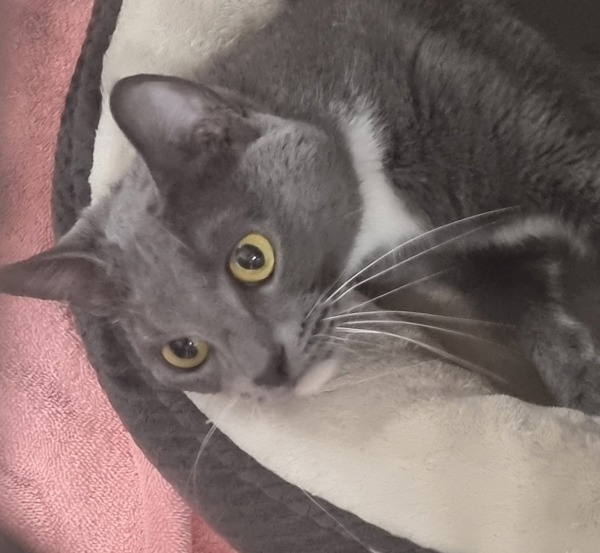 Izzy is a gorgeous grey and white queen with striking looks and a personality to match. With humans, she's all love - smoochy, affectionate, and always ready for pats, cuddles, and attention. She'll happily follow you around the house like your little shadow, just to be near you.