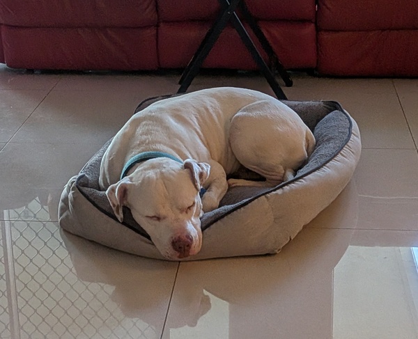 The sweetest big boof you will ever meet. Reiko is a fun loving doggo but sometimes can be a little too silly and takes his love to the next level - which includes, bouncies, kisses and zoomies all over his people. Despite this silly behaviour, he is very smart and loves to learn new things. So far, he already knows, sit, shake, and wait. It is very important for a doggie like Reiko to keep practicing positive and appropriate behaviour around his human friends, so continued training is a must. He loves chicken so this would be a great training tool!!