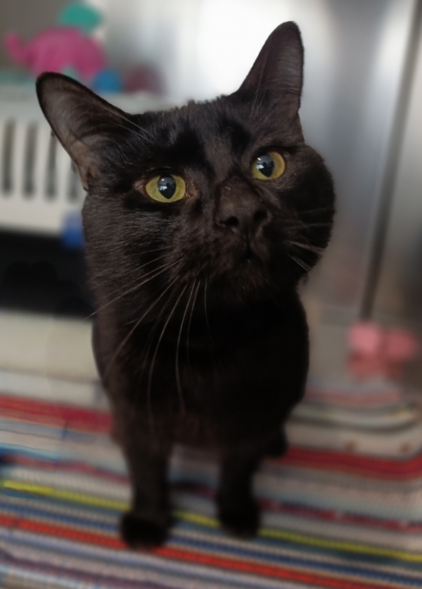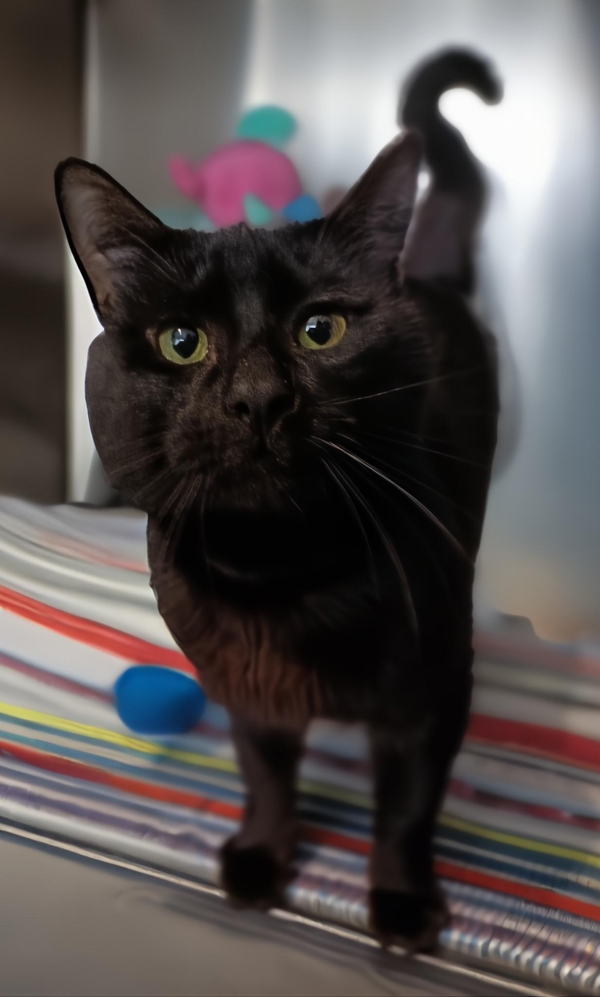 Meet Damon, a confident and outgoing black Domestic Shorthair with a big personality to match his big frame. At around 2 years old, this affectionate boy is full of charm and curiosity. Damon loves human attention, happily soaking up pats and following you around for a bit of companionship. He's lived with other cats and gets along well with feline friends, making him a great candidate for a multi-cat household.