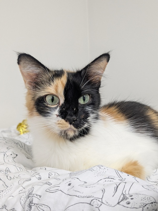 Meet Zelda, a sweet and gentle girl looking for a calm, understanding home. She can be timid and easily overwhelmed in new environments, so starting her in a small, quiet launch room is essential before gradually allowing her to explore the rest of the house. Zelda will feel most secure with plenty of safe spaces such as cat trees, scratch posts, cardboard box hides, and access to shelves or dressers for high and low resting spots.