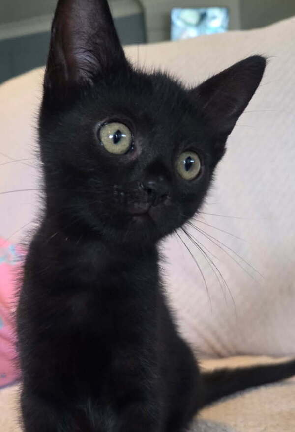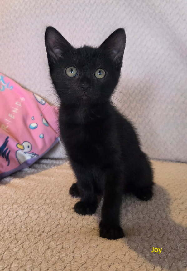 Hi, I'm Joy, and I'm ready to bring happiness into your home! I've been raised indoors since I was tiny, so I'm looking for a safe, cozy life inside with my forever family. My sleek black coat makes me look like a little panther, and I love exploring and playing with toys.
