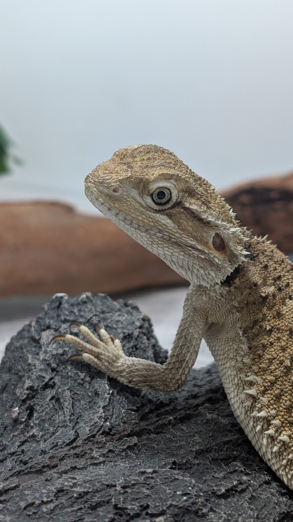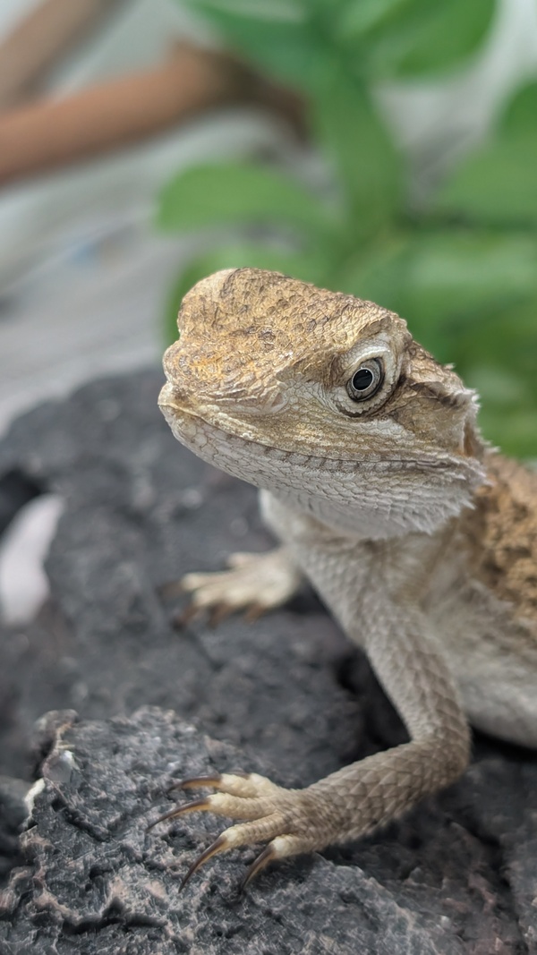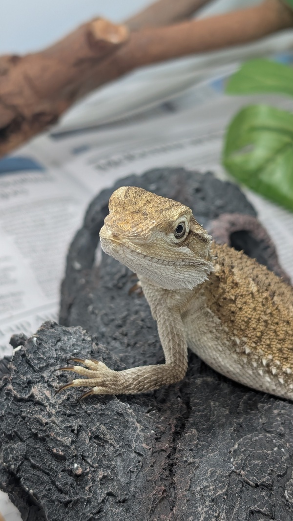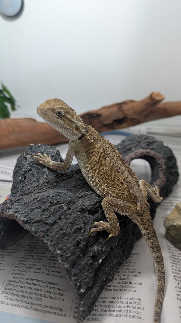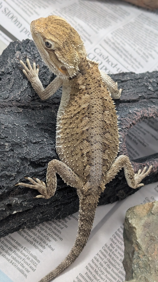 Hi there my name is Fizz and I'm a Rankin's Bearded Dragon! You would usually see my species in a small arid area of northwest Queensland. We love to scurry around, soak up the rays on warm rocks and climb onto tree trunks.I enjoy sunbaking and my favourite activity being a solar panel, as you can see from my photos! I'm really not the biggest fan of being picked up and would prefer to hang out in my enclosure and watch what you're doing.I'm an omnivorous lizard, which means I require a wide range of vegetables and insects to help me stay healthy. I love to hang out on my raised log to bask on. I also require a UV light, heat lamp, water bowl and a hide if I need a getaway. If you think I might be the perfect fit for your family, please fill out an adoption application today! https://www.rspcaqld.org.au/expression-of-interest-to-adoptAdoption price: $185Pogona henrylawsoni20cm~
