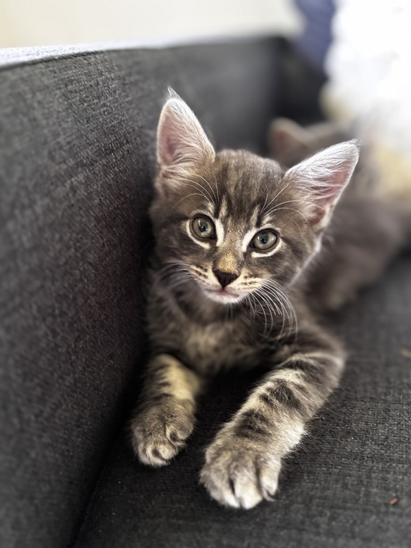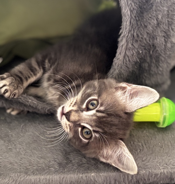 I'm a handsome grey tabby kitten with the softest stripes and the biggest, brightest eyes you've ever seen. People say I'm full of personality-and they're right! I'm playful, curious, and always up for an adventure. Whether it's chasing a feather toy, exploring new corners, or curling up for a cozy nap, I make every moment fun.