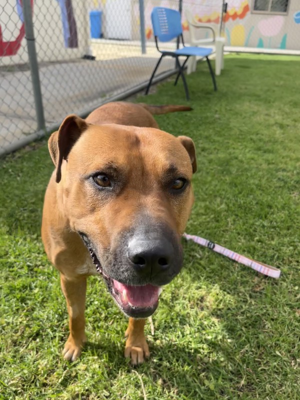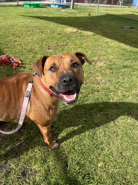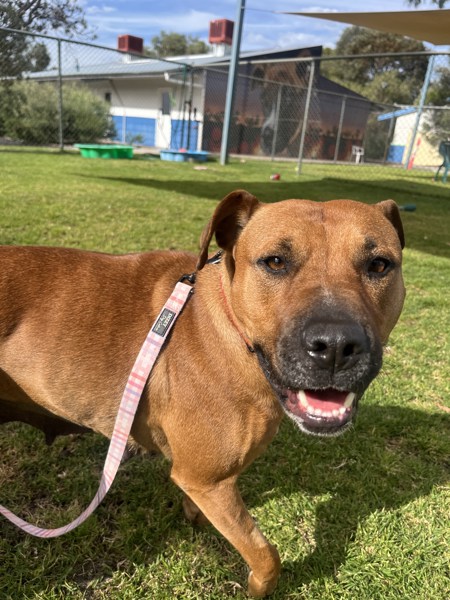Hi there, I'm Birdo! I'm a 5-year-old Staffy mix with a gentle heart and the sweetest smile you'll ever see. I might look a little shy at first, but once I get to know you, I'm all cuddles, tail wags, and happy sighs. I've had a bit of a quiet start in life, so I'm looking for a calm, patient home where I can feel safe and loved as I come out of my shell.
