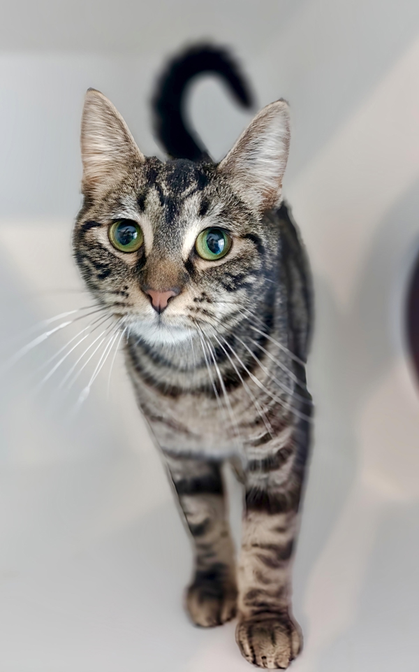 Meet Panda-a female tabby with a silky shorthair coat and a heart full of spunk. She's an outgoing, active girl who loves to explore, play, and chat-yes, she's quite vocal and enjoys a good meow to grab your attention. Panda is food-motivated in the best way, always excited for a tasty treat or a shared meal, and she keeps life lively wherever she goes.
