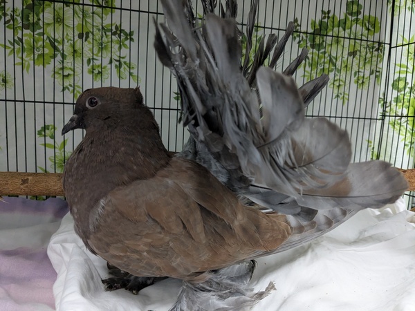 Meet Kim K. - a fantail pigeon who's looking a little ruffled at the moment, but has so much beauty waiting just beneath the feathers. With a proper diet, a full moult, and a bit of time, Kim K. is expected to grow into a truly stunning fantail.
