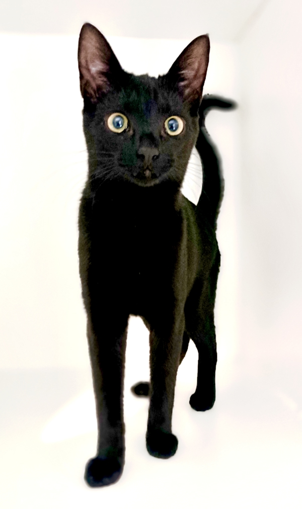 Meet Coco, a female black cat described as an "older kitten"-she's endlessly social with a lovely, outgoing nature. She loves people, enjoys attention, and is always up for a playful cuddle or a curious exploration. Coco boasts a sleek coat and long legs, and her endearing cross eyes give her a touch of oriental elegance-she may be part Oriental in appearance.