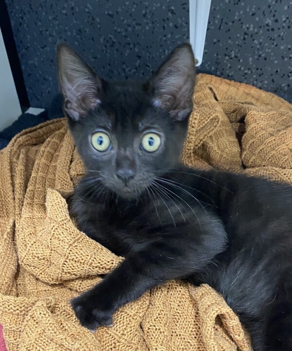 Knight is a stunning little boy, with a sleek black coat and big, beautifully contrasting eyes that immediately capture your heart. He's a curious kitty who loves to explore his surroundings, always eager to see what's happening around him. One minute Knight is playful and full of energy, chasing toys and investigating every corner, and the next he's happily stretched out, sleepily lounging and soaking up the calm. His charming balance of curiosity and relaxation makes him a wonderful companion. Knight would thrive in a loving home where he can play, nap, and be adored as part of the family.