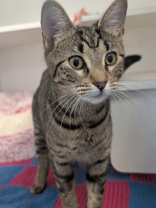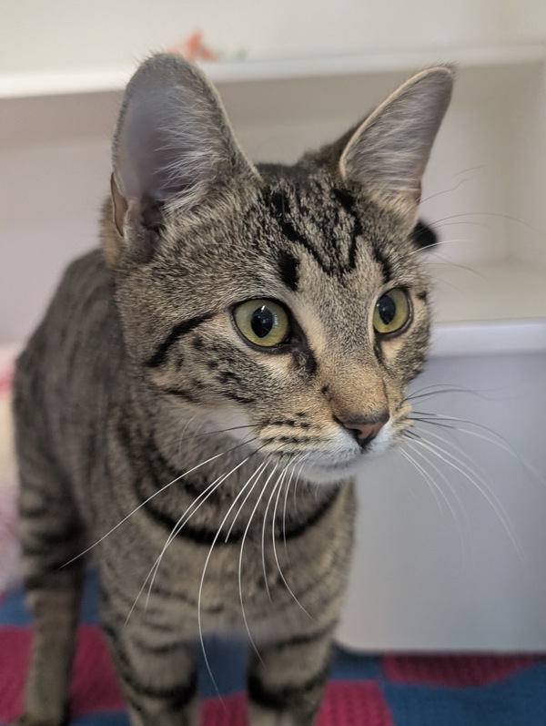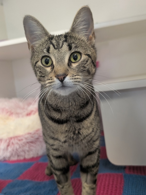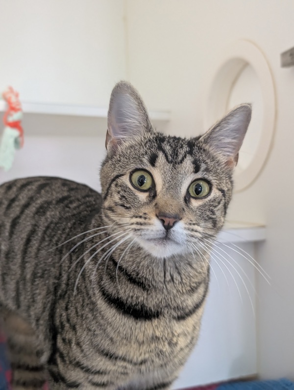Amber is an adorable 11-month-old tabby with some of the most unique, expressive eyes you'll ever see. Her gaze is full of curiosity, warmth, and a little bit of mischief - it's impossible not to fall in love the moment she looks your way.