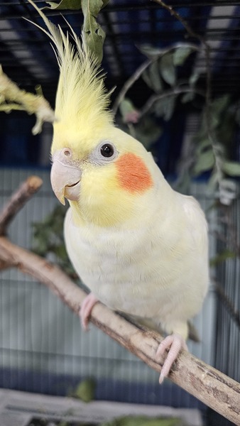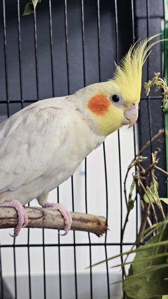 These two met at the shelter and quickly became each other's comfort birds, often enjoying mist baths side-by-side and sharing quiet moments on the perch. Flapjack helps Pancake feel safe, and Pancake reminds Flapjack to slow down and enjoy the calm.