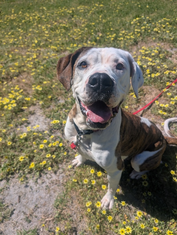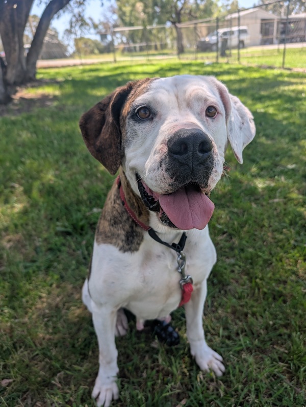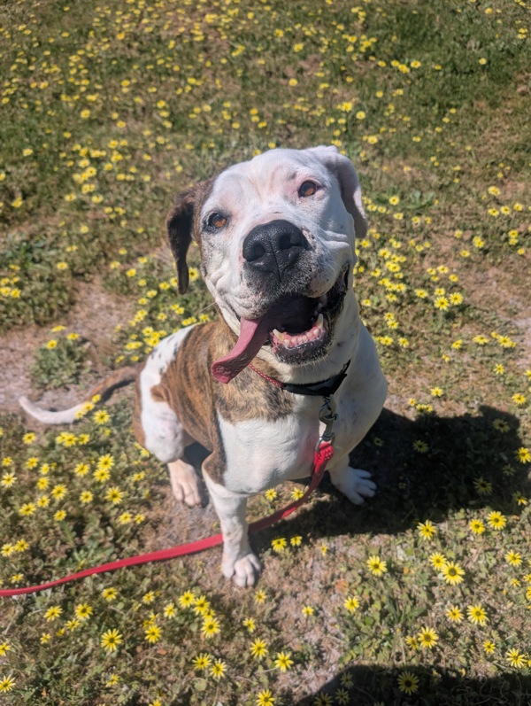 Hi, I'm Kyla, a bright, cheerful 5-year-old American Bulldog with the perfect mix of easy-going charm and lively, happy energy. I love my comforts - soft beds, gentle fuss, and a good snooze and lots of yummy treats along the way - but don't let that fool you, I still enjoy my playful moments and a good burst of excitement when something fun is happening.
