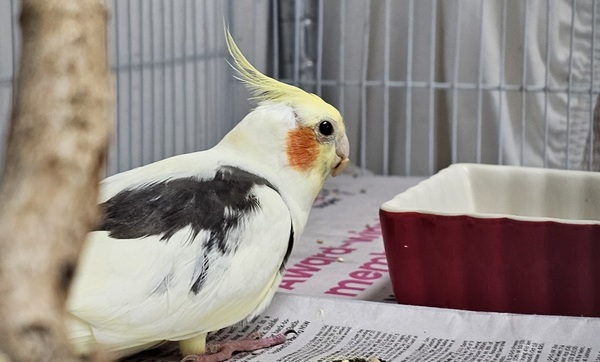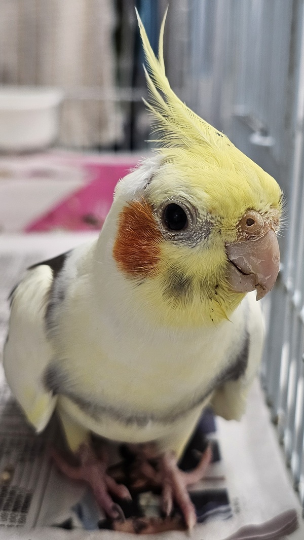 These two met at the shelter and quickly became each other's comfort birds, often enjoying mist baths side-by-side and sharing quiet moments on the perch. Flapjack helps Pancake feel safe, and Pancake reminds Flapjack to slow down and enjoy the calm.