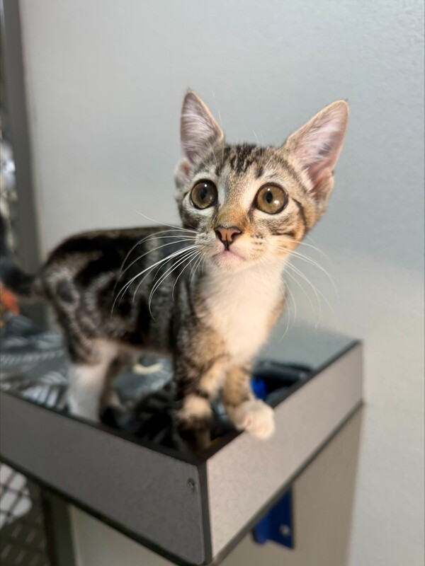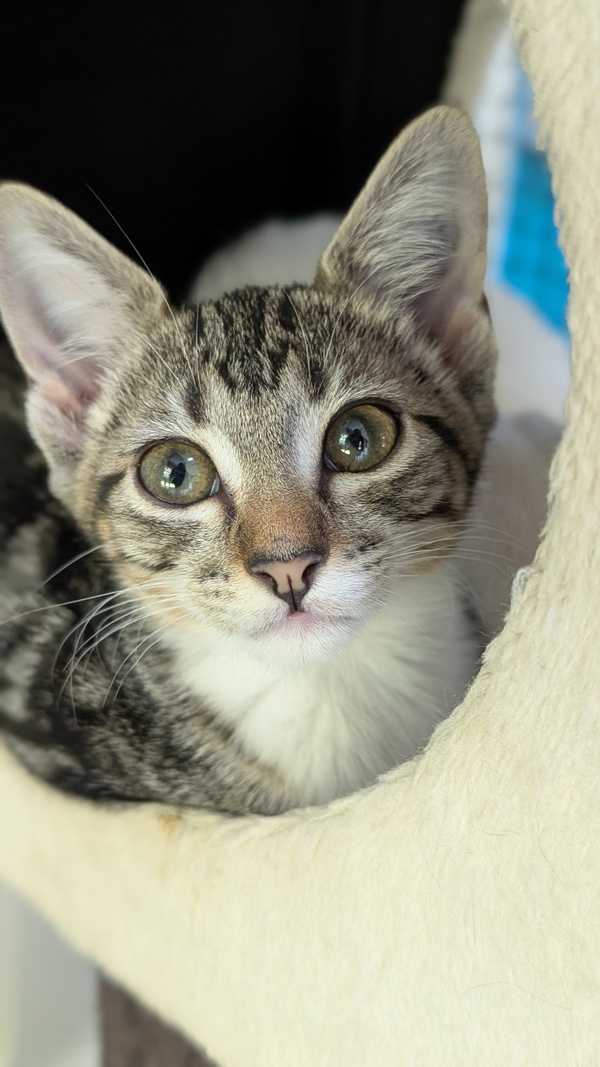 Purr, I am Opalite,You will spot me immediately in the catio since I have stunning classic tabby markings. I am a high energy kitten, very active when playing with other cats and kittens and cats. I like to climb and view the world from on-high so would love a cat tower in my new home. I also have an independent side, enjoying quiet time in the sun but I am a sociable kitten with people. I come up for stroking and to lie beside you being a companion. If you would like a kitten like me, I am looking for my forever home after my earlier weeks as a stray. However, I was in foster care and I am used to living the good life in a house with cats, a small dog and adult carers, so I am sure with the right socialisation in my first few days I will be the perfect addition to any household.My adoption price includes: A FREE 2kg bag of ROYAL CANIN dry food My desexing, microchip and vaccinations Adoption Price: $325 If you think I might be the perfect fit for your family, please fill out an adoption application today! www.rspcaqld.org.au/apply-to-adopt