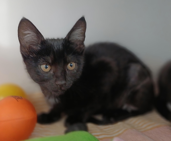 Knickers is a sweet female black kitten with a gentle, lovely nature. She's a shy girl at first and will need a little time and patience to build trust, but beneath her quiet exterior is a truly special soul. Knickers feels most comfortable playing with her litter mates, where her playful side really shines.