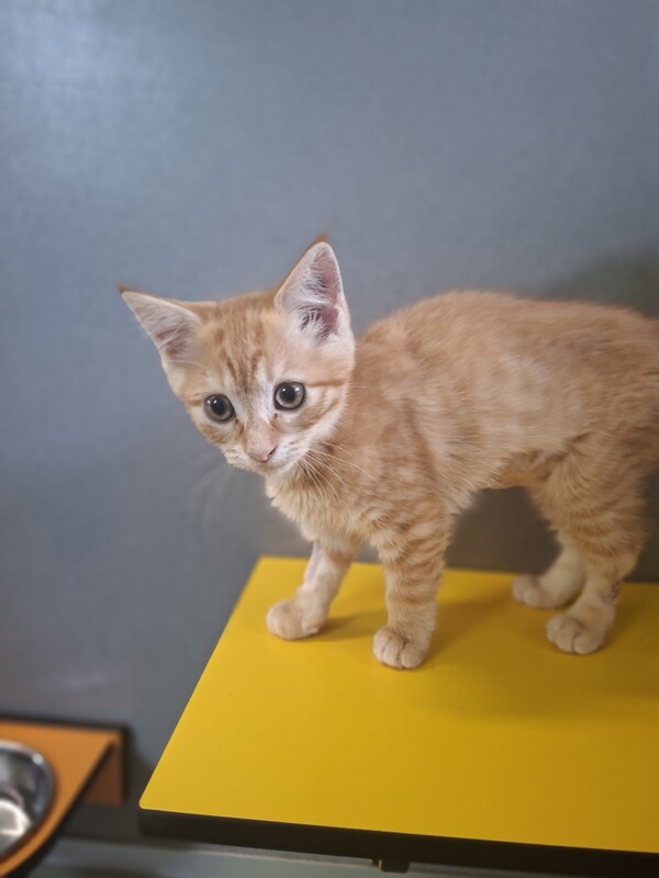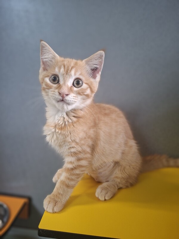 This sweet little girl is a gentle, shy kitten who is still learning that the world is a safe place. She may need a bit of extra time to come out of her shell, but once she feels comfortable, her soft, affectionate nature begins to shine. She enjoys quiet pats, cozy hiding spots, and watching the action from a safe distance before getting involved. With patience, reassurance, and a calm home, she will blossom into a loving companion. This darling kitten would do best with an adopter who understands that good things take time and is happy to let her set the pace as she builds confidence and trust.