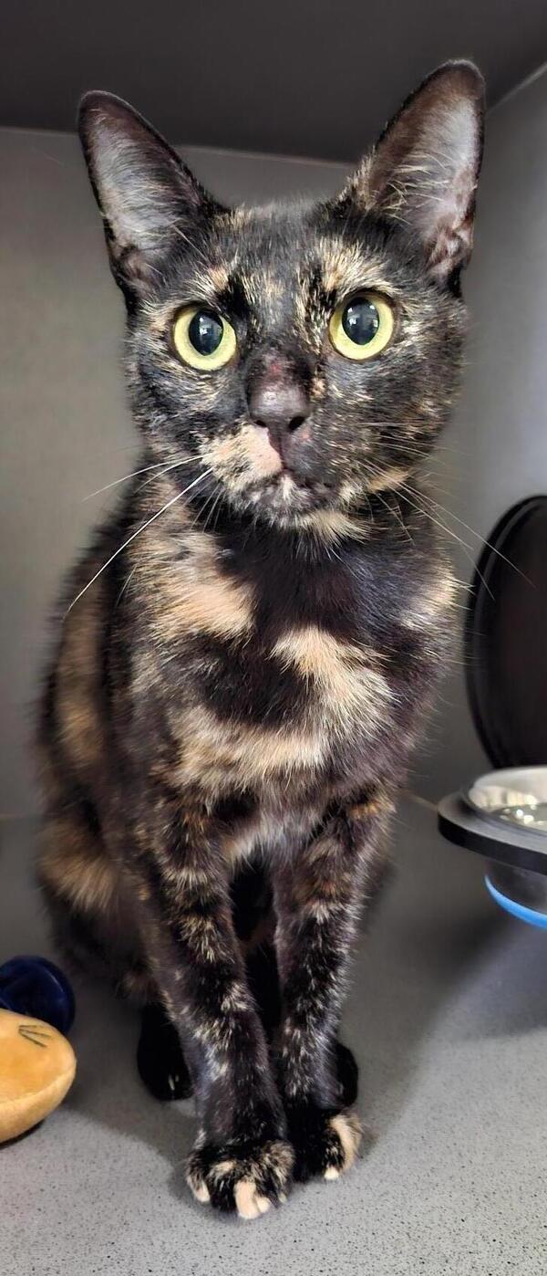When you have a kitty-cat like Rizzo, everyday will be an amazing time of sharing cuddles and affection with your girl. Rizzo has a gentle and loving nature and you'll never feel alone in your home. Every time you look around, there she'll be, waiting for you. Her black tortoiseshell coat is silky soft and shows off her big yellow eyes. Rizzo will be your loving companion for many, many years. Recommendations for her care: