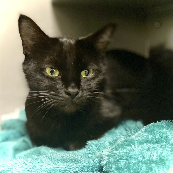I'm 11 months of age, and with good care from my new guardian, I'll love you for at least the next 10 years. My health is very good. I have a beautiful, medium-haired coat that is as dark as night and blazing yellow eyes. My big fluffy tail is just the best!