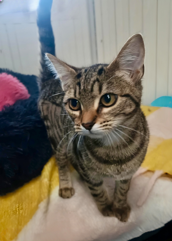 Squeaks is a charming little female kitten with beautiful tabby colouring and an even more beautiful personality to match. She loves nothing more than curling up in a cosy spot for a peaceful snooze, but she's always ready to spring into playful action when the mood strikes. With her lovely balance of calm and energy, Squeaks is an easygoing companion who brings a gentle, happy presence into any space.