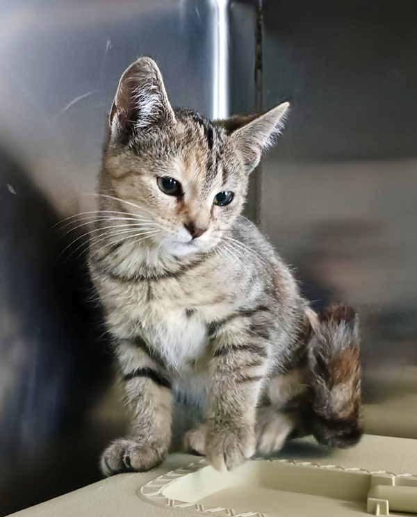 Anthea is a pretty little tabby torti girl with a unique look and a wonderfully expressive face-often sporting a slightly unimpressed expression that only adds to her charm. Rescued from the wild, she's still learning that the world can be a safe and loving place, and she's making lovely progress every day. Though naturally shy, Anthea is steadily gaining confidence and starting to show her sweet, gentle personality.