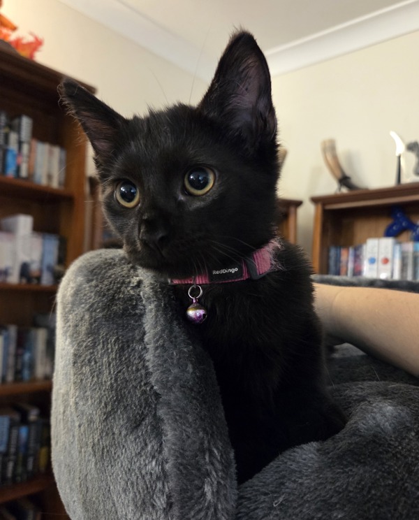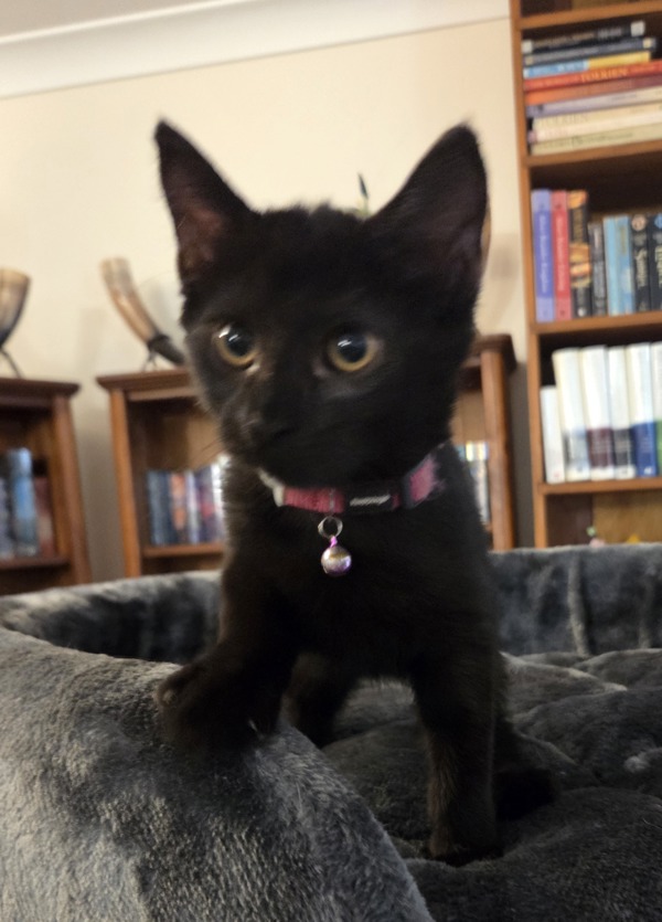 Meet Vesi - a sweet little bundle of joy with a playful spirit and a heart full of love. This adorable black kitten brings fun wherever she goes, whether she's chasing after toys, bouncing around with endless energy, or curiously exploring her surroundings.