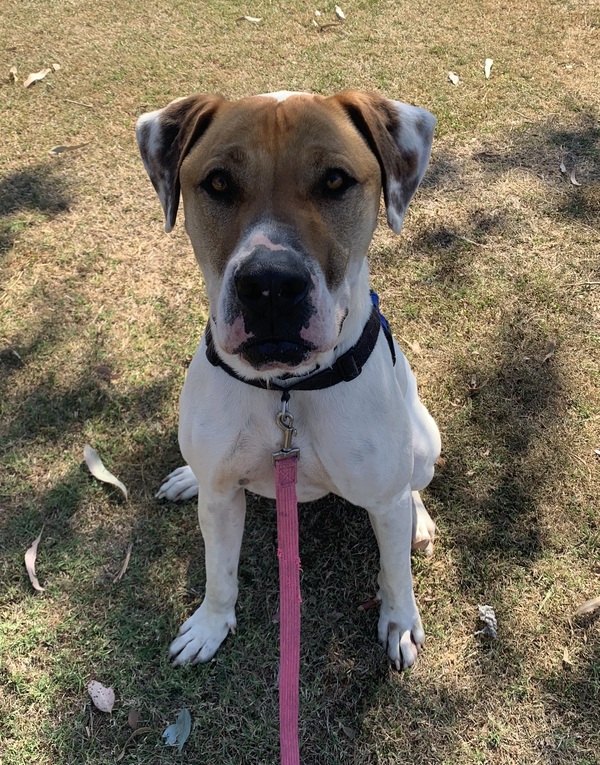 Pogo is a gentle giant who enjoys love and affection. He would love a quiet home where he can have indoor and outdoor time with him family. He enjoys being close and seeking out attention from those around him. Pogo is quite calm and gentle with his interactions. Pogo doesn't jump up and likes to give gentle slobbery kisses. Nevertheless, he can be worried by some doorways and stairs: needs encouragement here. Pogo may seem somewhat hesitant in the home so will need to support him if he becomes worried. He knows how to sit and can lure to 'down' easily with food. Pogo is a little on the lean side so will need to gain some weight. Offer meals from enrichment to see what challenges he enjoys. Pogo is open to the right family - must meet all children at time of adoption to make sure he is comfortable with them. He'll also need to meet other dogs. Pogo is not suited to dog parks and he will need thorough meets with other calm female doggos.
