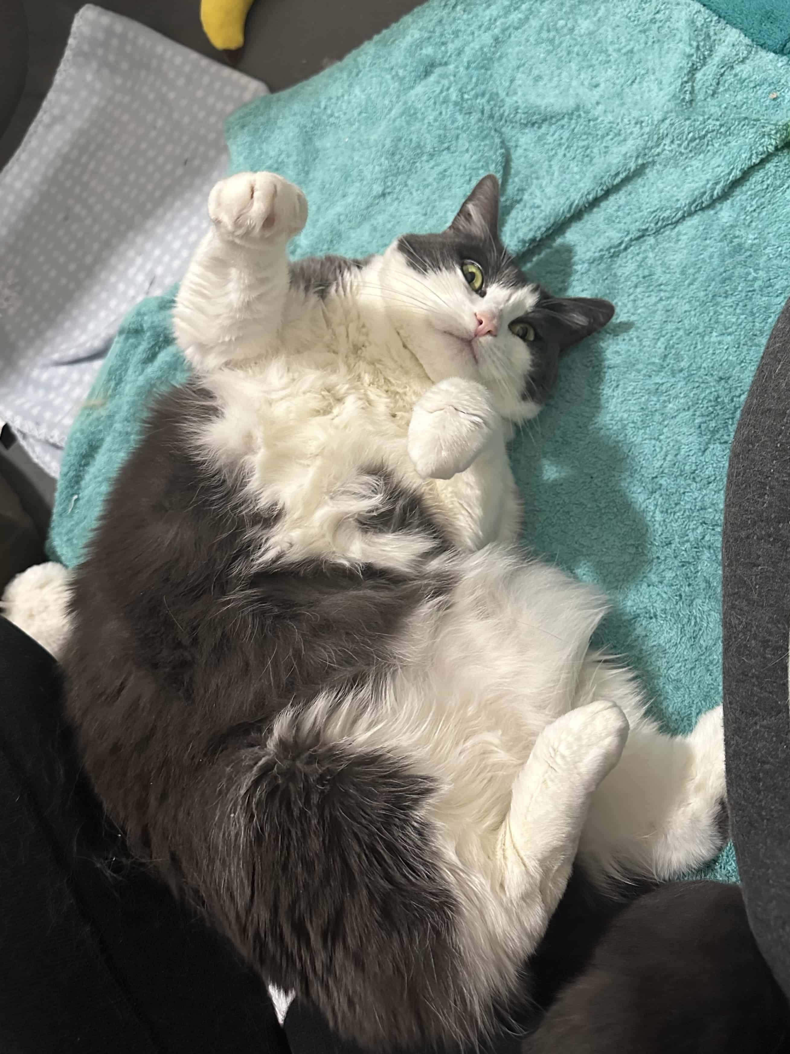 I can be a little shy with new people or sudden noises, and I'm still figuring out how I feel about other cats. I don't hiss or lash out - I just prefer a calm, respectful vibe. My bestie Charlie and I get along really well, sometimes we nap nearby or share a moment, but I also enjoy my own quiet space. And if he gets a bit too enthusiastic with the head boops, I let him know - politely, of course. My love language? Belly rubs. Once I'm comfortable with you, I'll roll right over to show you my fluffy tummy - and yes, I actually want you to rub it. I also adore curling up in my igloo bed on cold days or snuggling next to you on the couch.