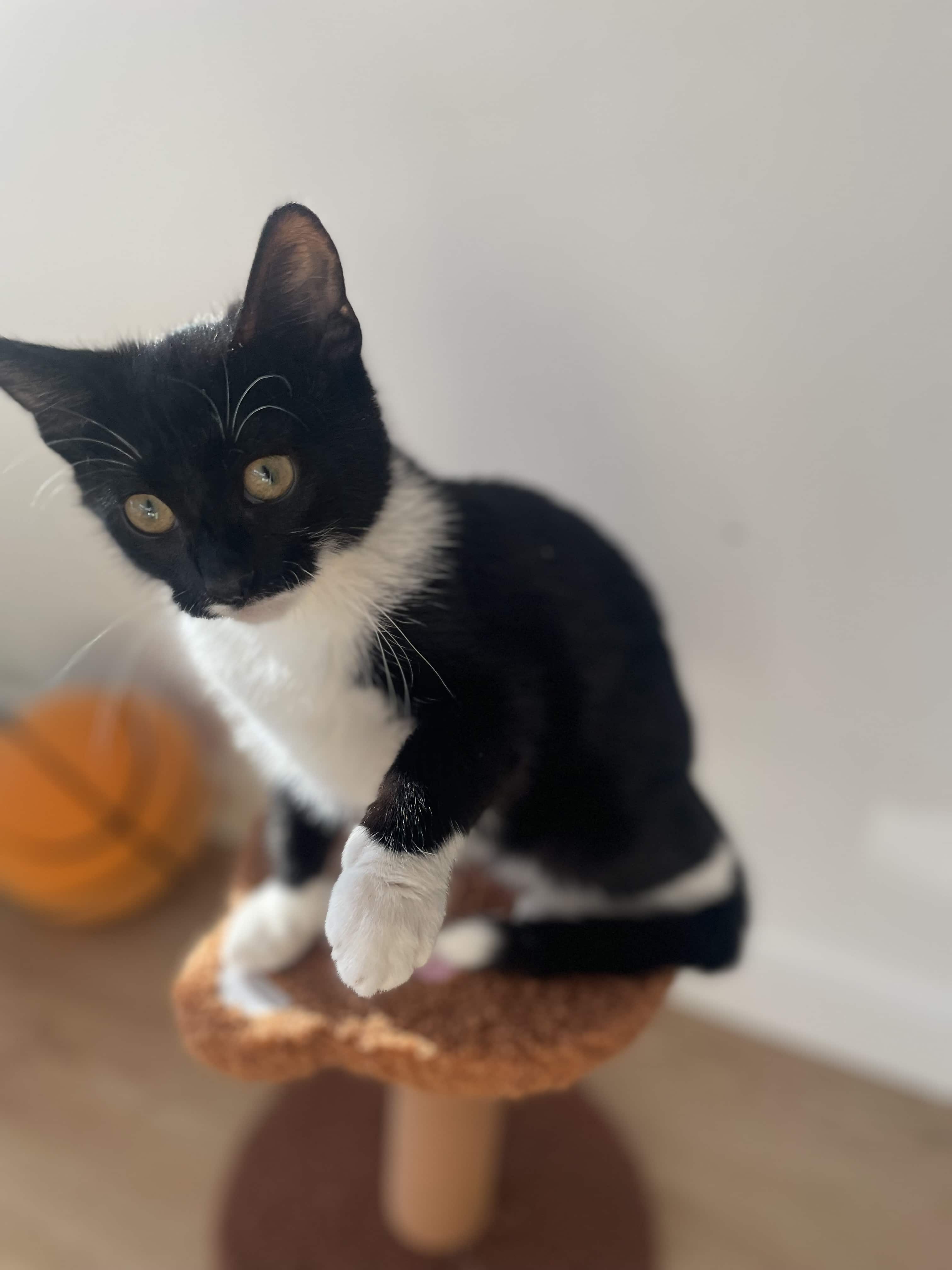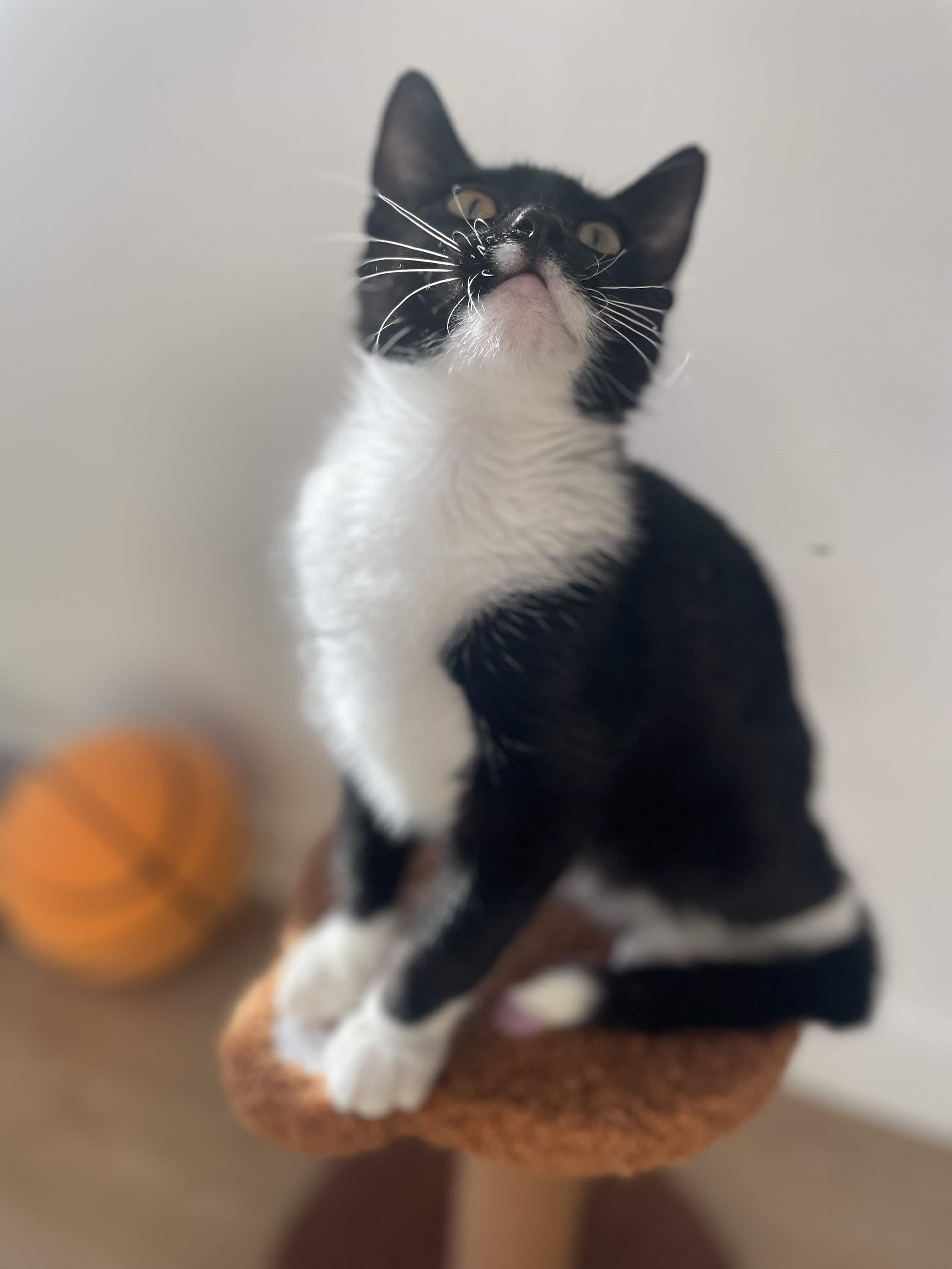 Pingu is a sweet and shy little kitten looking for his forever home. He may take a little time to come out of his shell but with patience and understanding his gentle and affectionate personality truly shines. Once he feels safe he loves nothing more than cuddles and quiet companionship. Because of his timid nature Pingu would thrive in a calm peaceful home without dogs. However, he would absolutely benefit from having a feline friend to help him build confidence and feel secure. Pingu is also quite the foodie treats are the quickest way to win his heart!