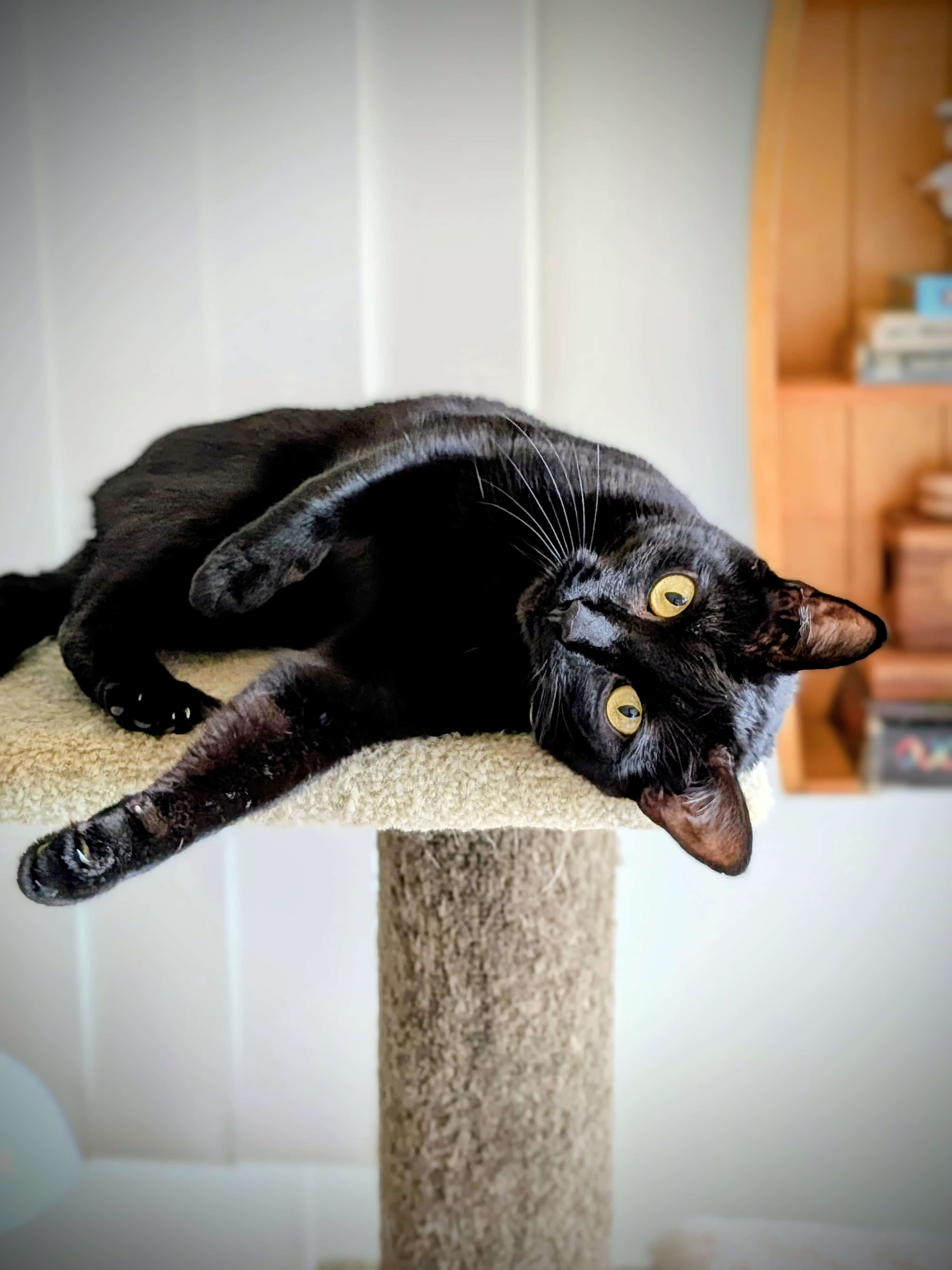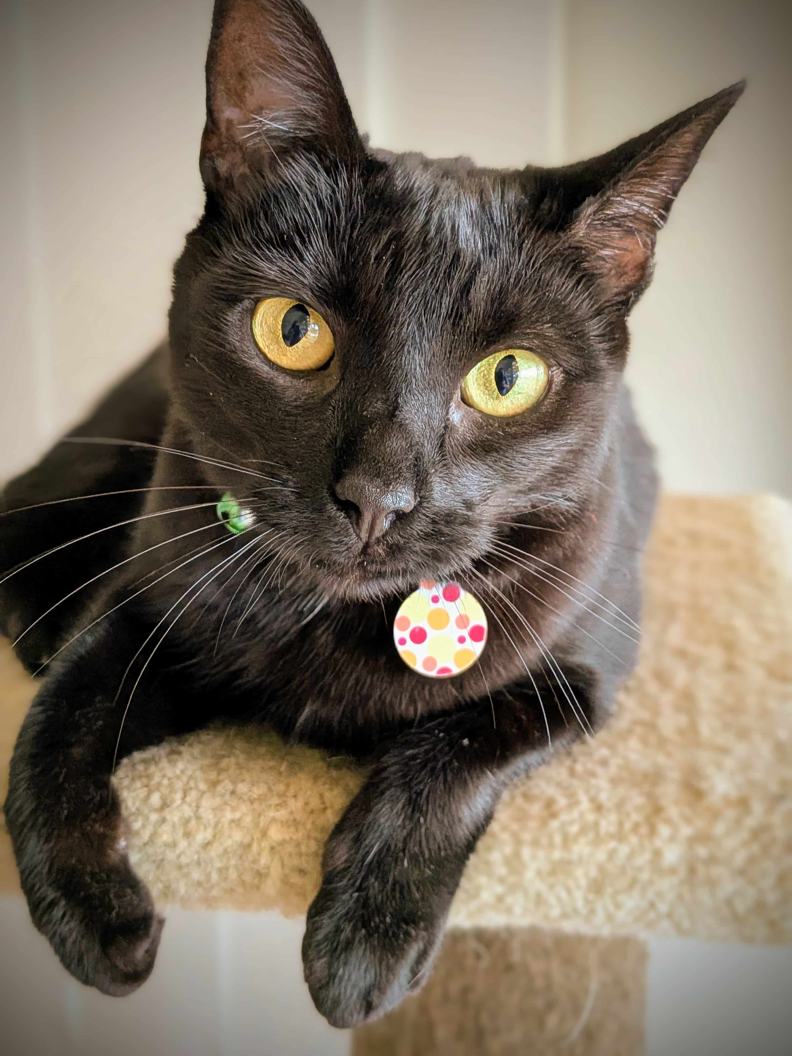 Velvet's name suits her well, as her shiny black coat is a wonder to pat. She loves her wet food which is what she uses to keep her coat sleek. As the diva she dresses up to be, Velvet would prefer a quiet home of her own with people she can snuggle with and watch some TV, which is the only place other animals should be. A cream treat is an indulgence to be used to capture her heart. While she likes to have a hidey hole to curl up in by herself now and again, she will still spend time with her people, offering head boops and affection.