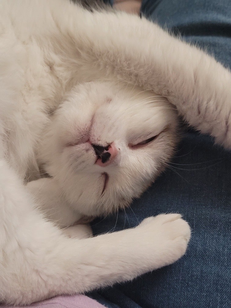 Though she’s mostly a napper, Sashi does have her playful moments—especially when the string toy comes out. She’s also very food motivated and has a particular fondness for chicken, which is a great way to win her heart. Once she bonds with you, she will be a loving and gentle companion who simply wants to share quiet moments and feel safe by your side.