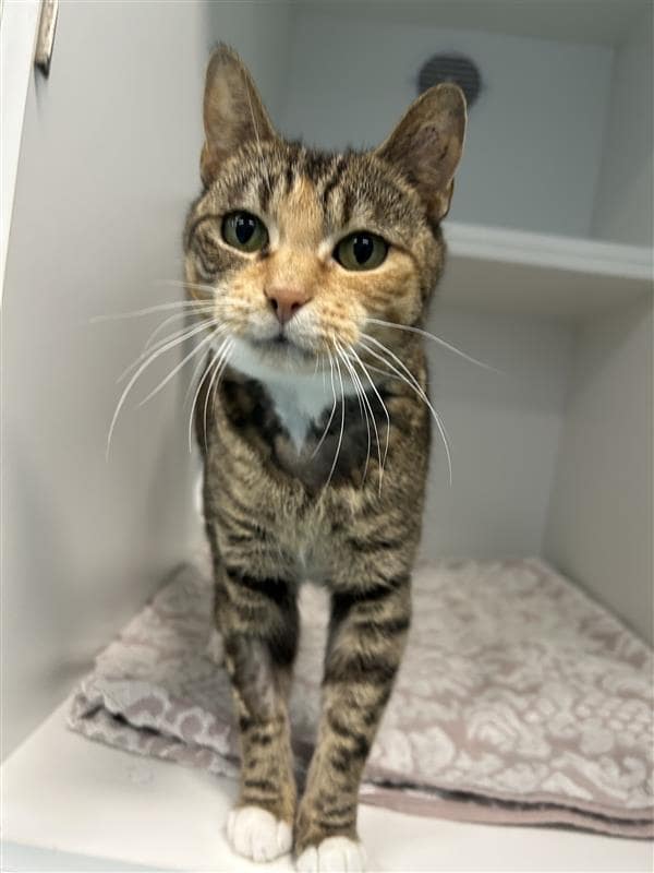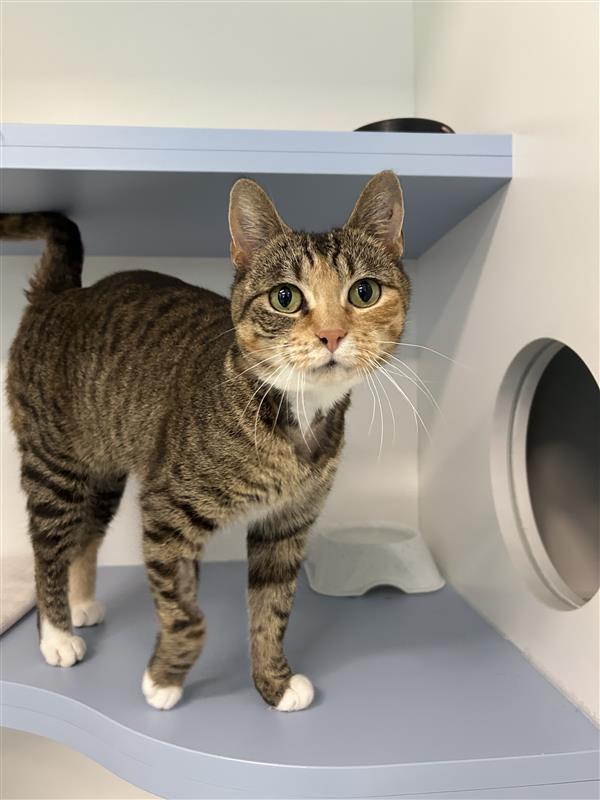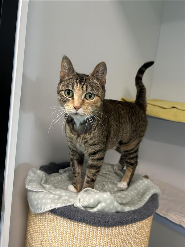 Hi, I'm Tilly, a female Domestic Short Hair. I'm 2 years old. My energy level is Average, which means I enjoy both relaxing cuddles and the occasional play session. I love sunbeams, soft blankets, and a gentle swat at feather toys. I’m curious, friendly, and very affectionate with the people I trust. I have no known issues with children, so I should be comfortable in a family with older kids or adults who will give me space and kindness. I’m a neat, tidy girl who is litter-trained and healthy. I’ll greet you at the door with a soft purr and a snuggle on your lap after a long day. I’m looking for a calm, loving home where I can settle in, receive daily affection, and feel secure. A home with routine, patience, and lots of gentle pets would be perfect. If you’re seeking a loyal, easygoing companion who loves quiet time as much as a gentle cuddle, I’m ready to fit into your life.