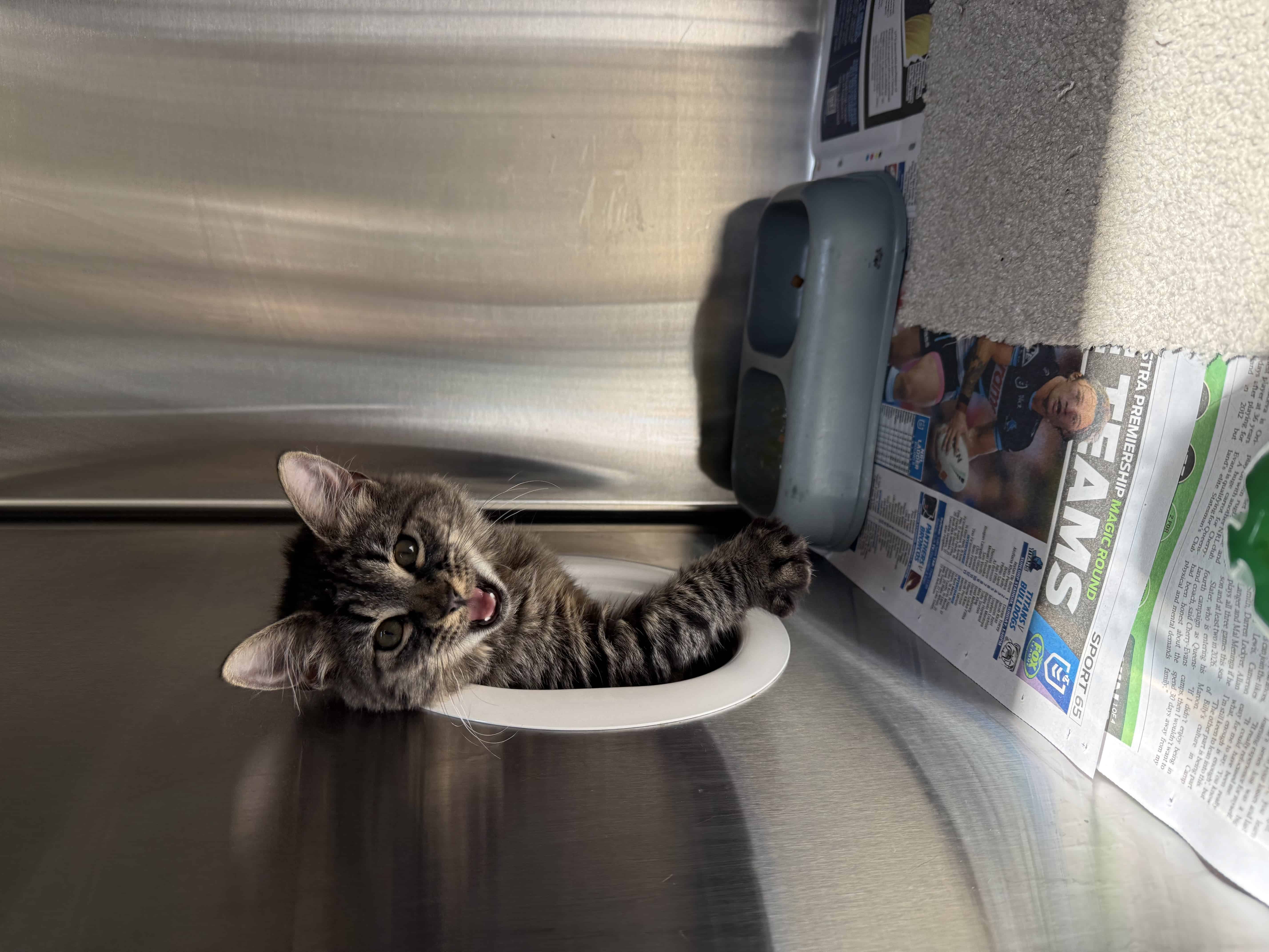 Hi, I’m Angie. I’m a female Domestic Short Hair kitten, age 4 Months. I’m a high-energy, curious explorer who loves playtime, chasing toys, feather wands, and zooming around the room. When I’m tired, I’m a total cuddle bug and love curling up in a warm lap after a good play session. I have no known issues with children, so I could be a great match for a family that can keep up with my lively pace. I’ll need an engaged home that can provide plenty of enrichment, patience, and love as I grow. Since I’m still learning, I’ll benefit from guidance and socialization to become a confident, well-behaved cat. If you’re looking for a playful, affectionate companion to brighten your days, I’m your girl.