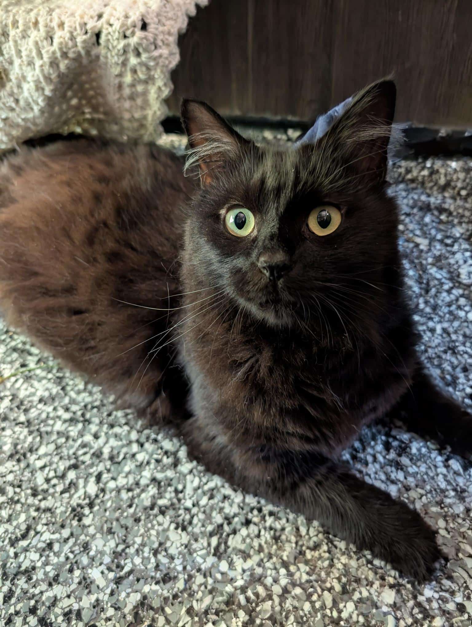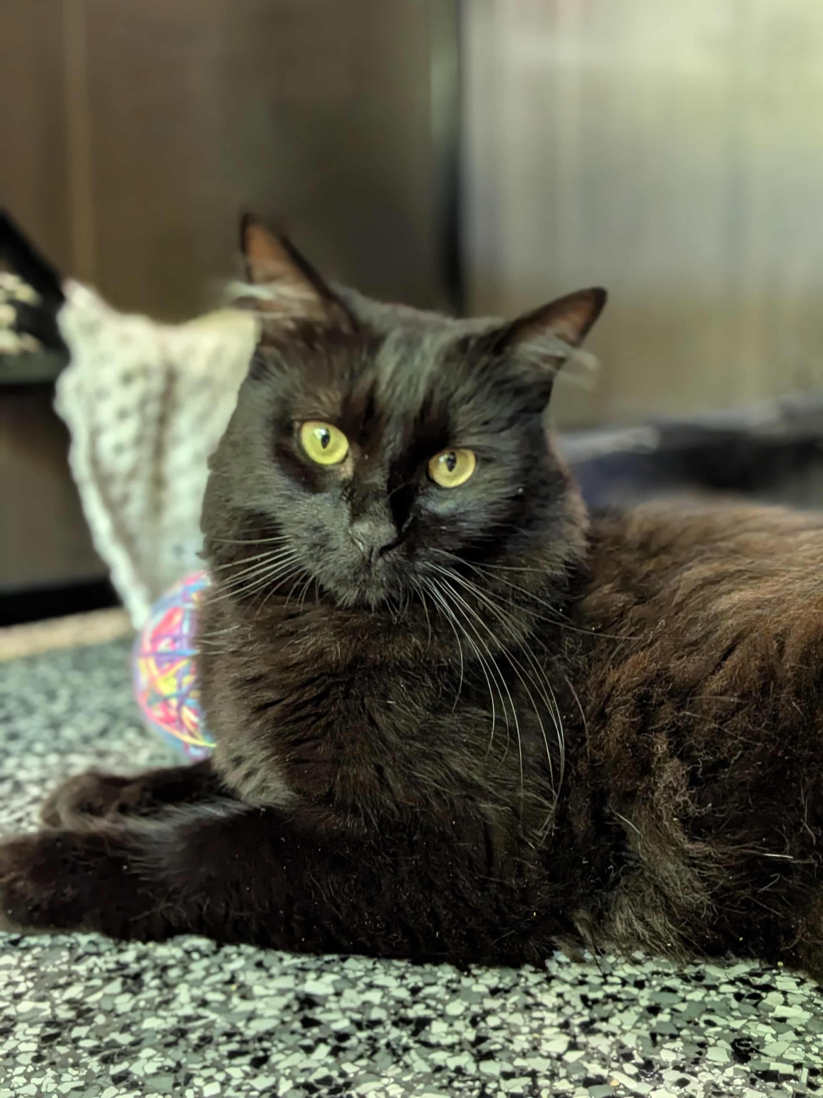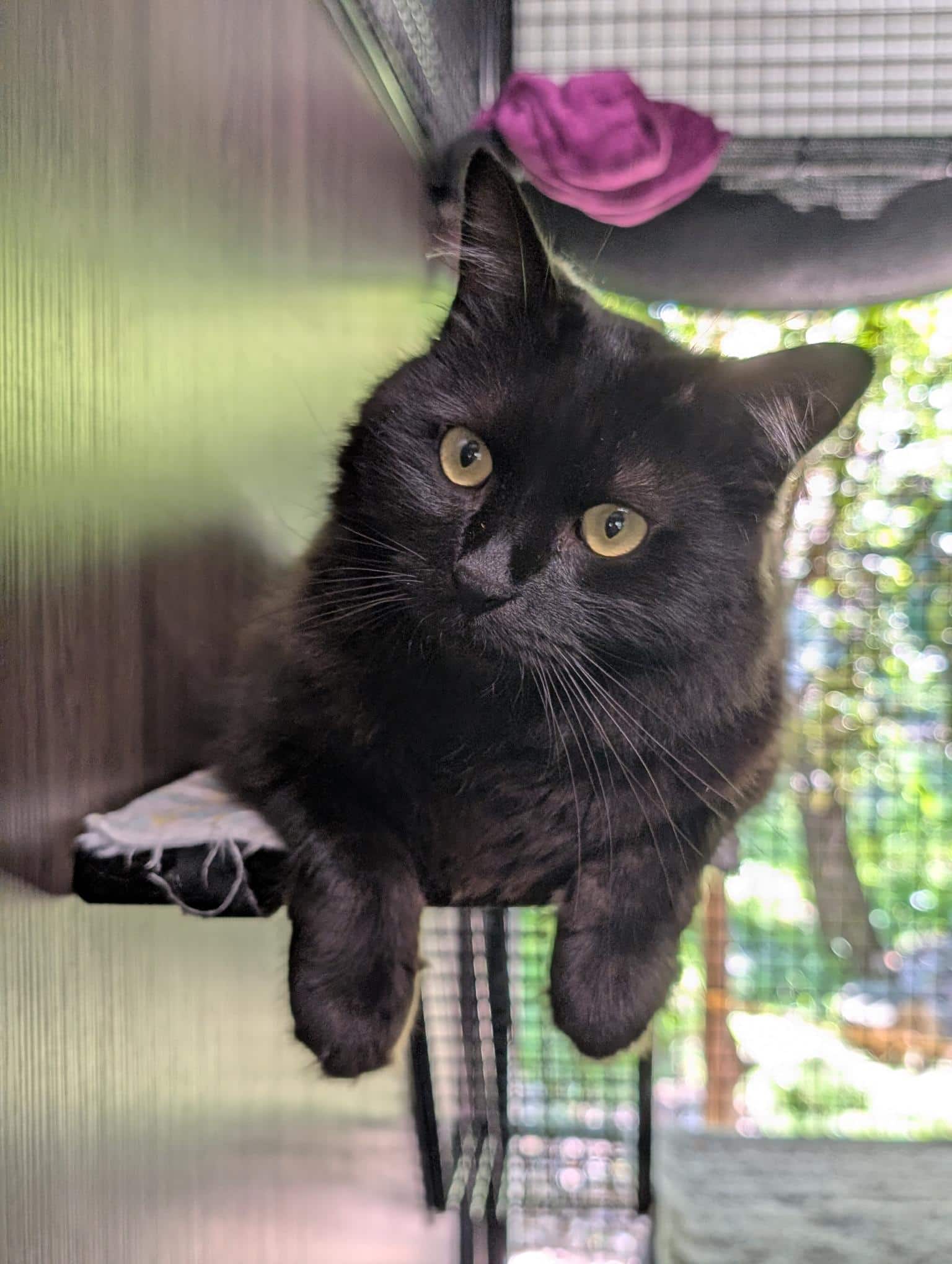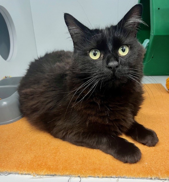 Salem is a beautiful black cat with a gentle soul. Though he is shy at first, she blossoms with patience and kindness. he loves quiet moments and gentle pets, especially in his favorite cozy spots around the house. Salem thrives in a calm environment where he can feel safe and slowly build trust with his humans. Because of his sensitive nature, he would do best in a peaceful, low-activity home without loud noises or lots of commotion.