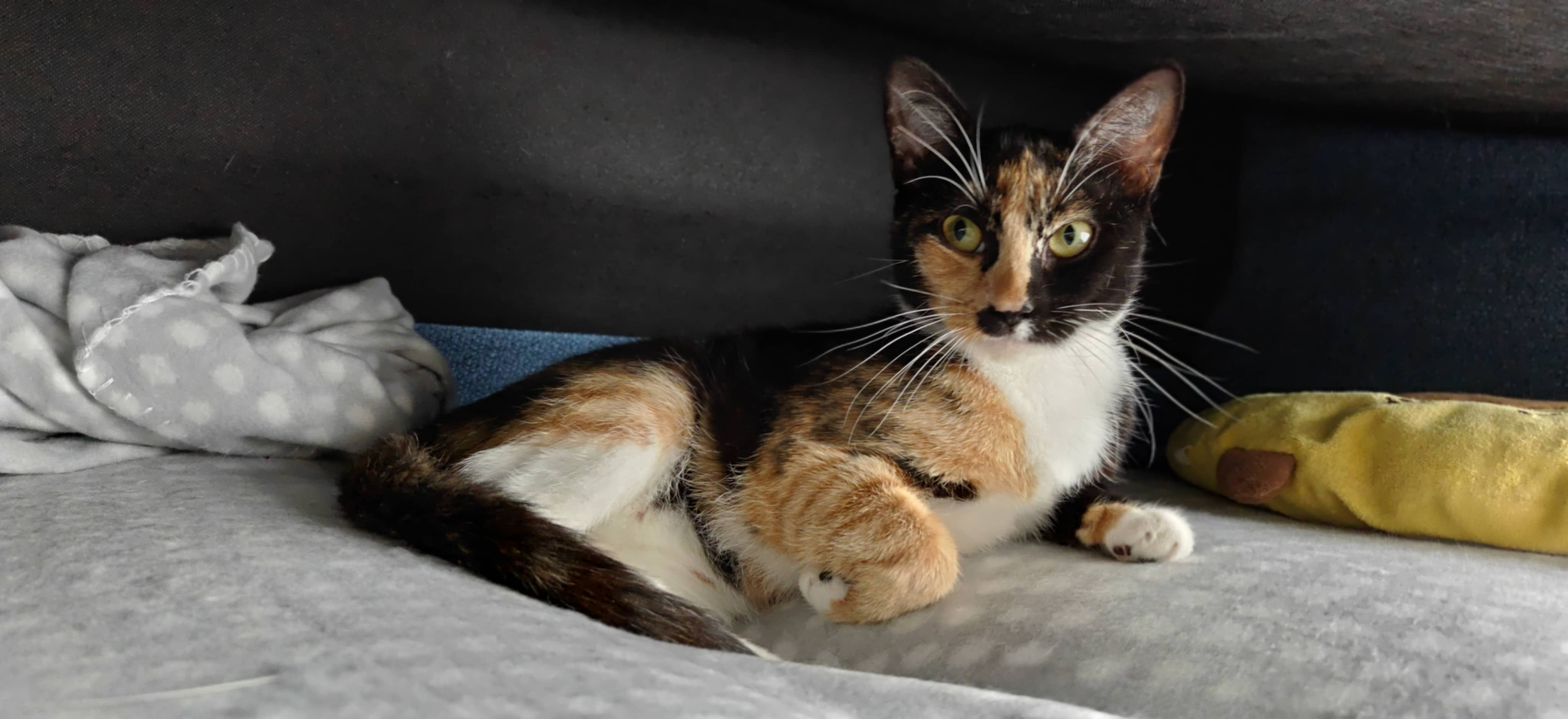 Hi, I’m a Domestic Shorthair girl with an independent and curious nature. I enjoy spending my time exploring my surroundings and entertaining myself through independent play. I’m still learning to trust humans when it comes to handling, but I show affection in my own gentle ways—often stopping by for a quick rub against you before heading off on my next adventure.