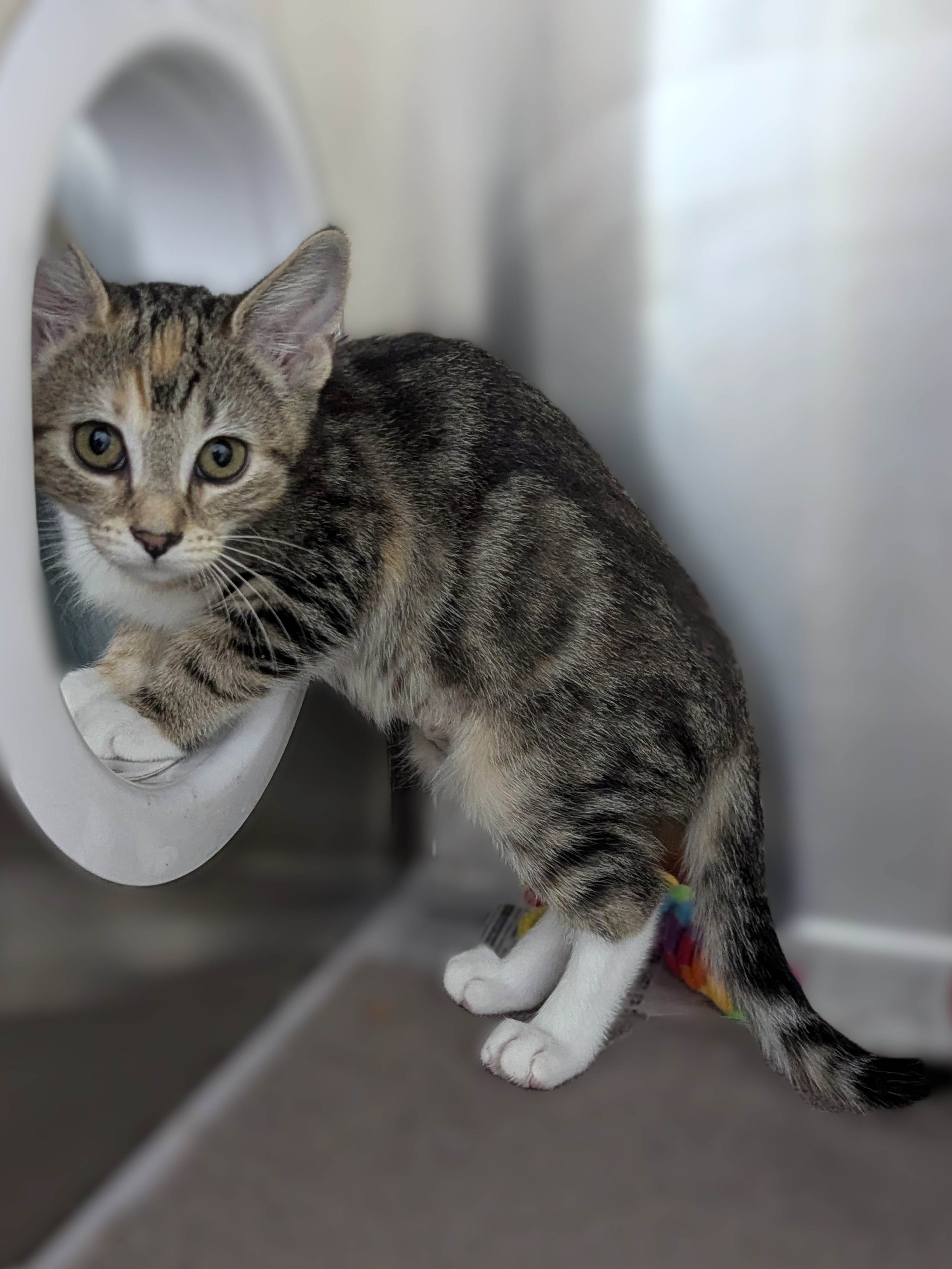 Hi, I’m Candy, a sweet female kitten looking for my forever family. I’m a Domestic Short Hair, and I’m 2 months old. My energy level is average—I’ll zoom around for a while and then happily snooze in a sunny window or in your lap. I’m curious, cuddly, and I purr as soon as you speak to me. I’m learning good manners and I’m litter trained. I love to play with a feather wand, chase crinkle toys, and then wind down with quiet cuddles. I’m brave about new people and helpers, and I’ll thrive in a home with patience and routine. Best with children: no known issues, so I think I’d do well in a home with respectful older kids or adults who will give me gentle guidance. I’m looking for a home that will provide cozy spots, a window for bird watching, and lots of daily love. If you’re seeking a sweet, adaptable companion who will grow with you and fill your days with purrs, I’m the one. Please ask about meeting me—I can’t wait to start our new adventures together.