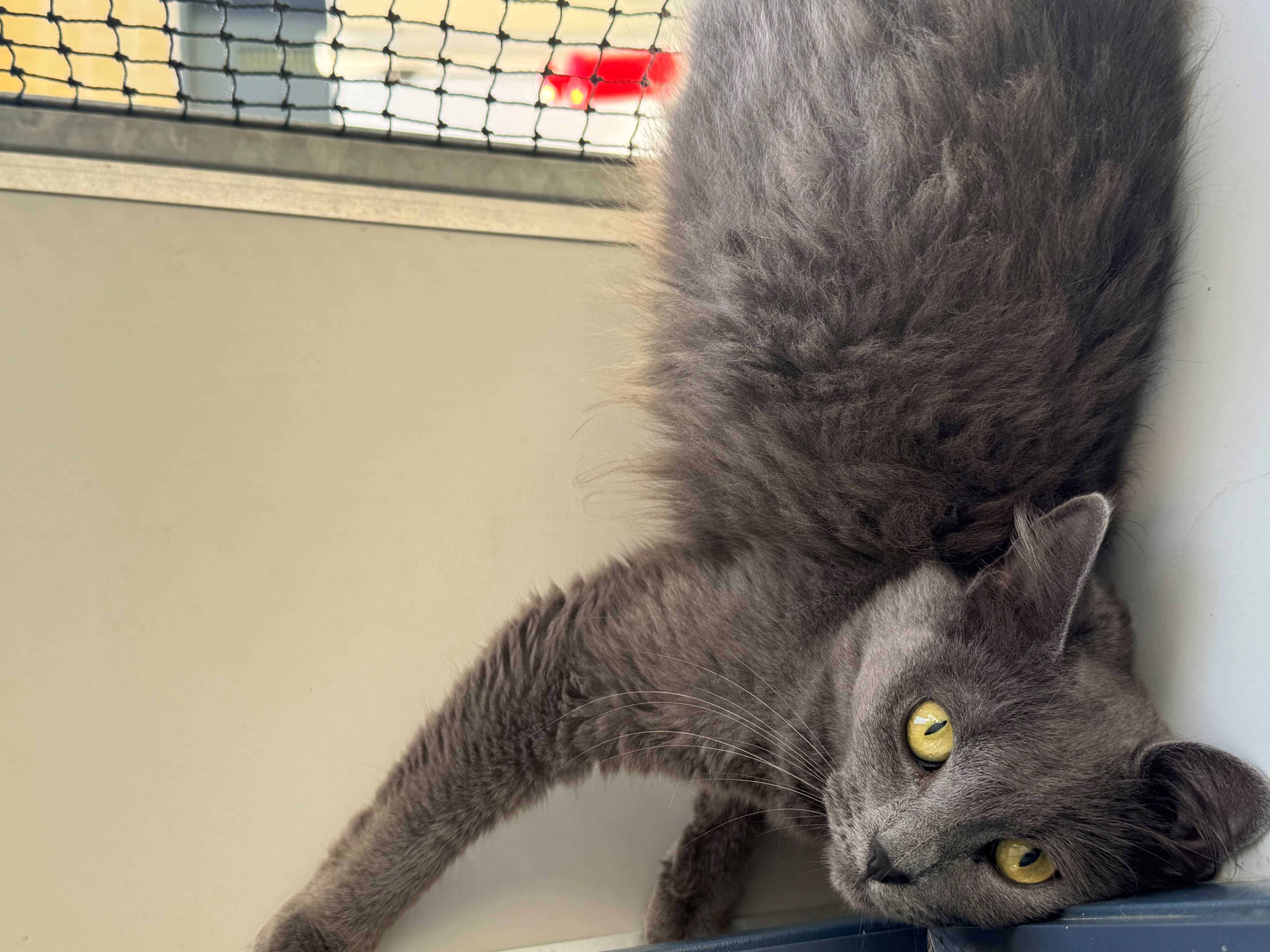 I’m a 10-month-old Domestic Medium Hair girl with the prettiest blue-grey coat — it’s super soft and very strokeable (once I know you’re my person!). I might look like a little cloud, but inside I’m still learning that the world can be a safe and gentle place.