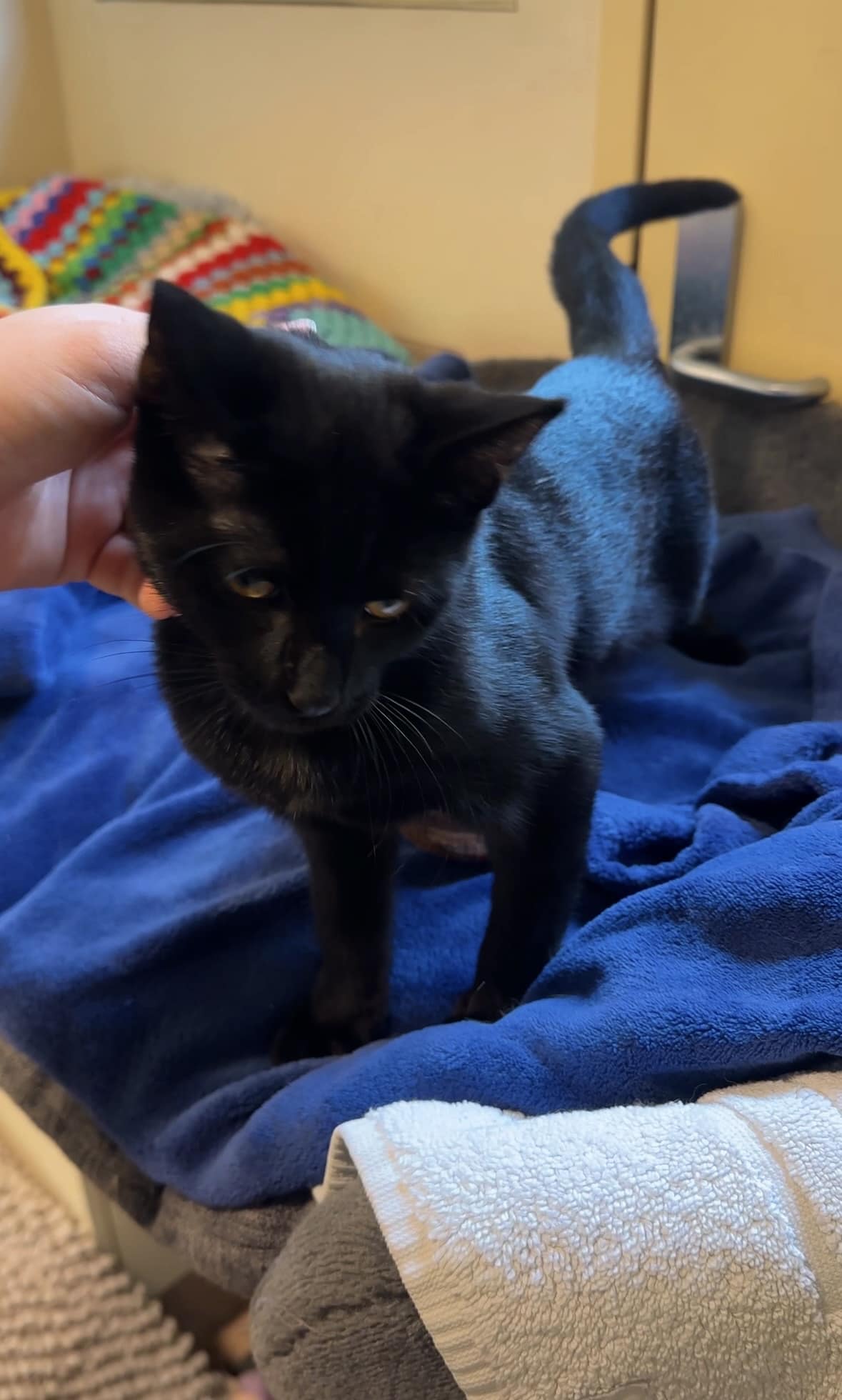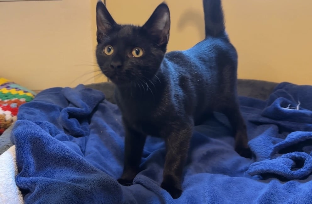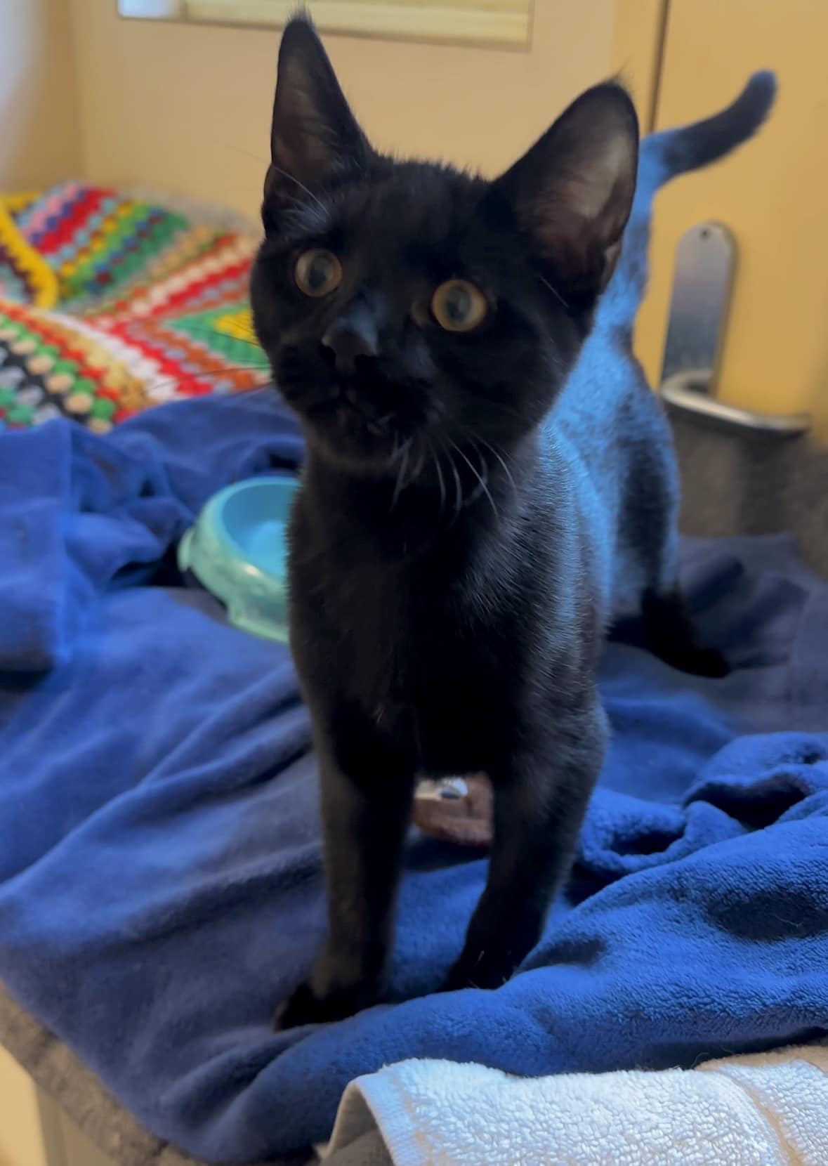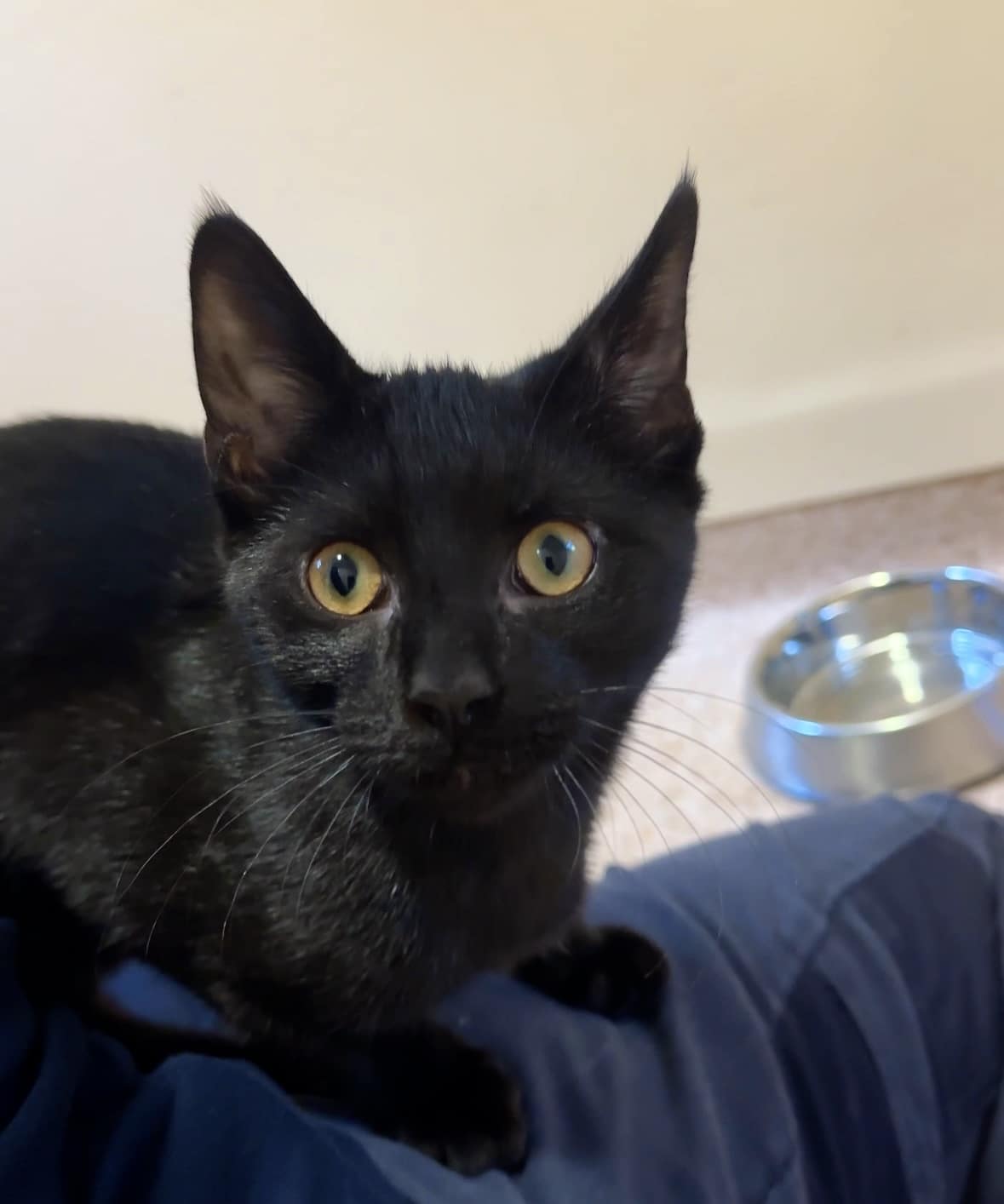 I’m a sweet little boy with the loudest, happiest purrs, ready to fill your home with love, play, and gentle companionship. With my sleek midnight fur and bright, curious eyes, I’m as charming as I am affectionate.