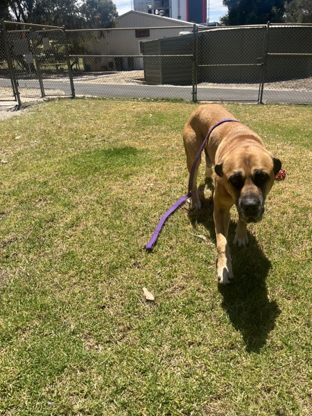 Hi, I'm Bruiser! I'm a big, goofy 5-year-old Mastiff cross with a lot of love to give and an even bigger personality. I'm known for making people laugh with my silly moments and for thinking I'm a lap dog... even though I definitely am not. I really love spending time with my humans and being part of the family. Because of my size and enthusiasm, I'd be best suited to a home with older children, and I'd prefer to be the only dog in the household so I can enjoy all the attention for myself. I enjoy my walks, a bit of playtime, and then settling down for a good snooze - preferably somewhere comfy. I'm affectionate, loyal, and happiest when I'm close to my people. I do have a couple of small health things that are part of my story, but they don't stop me from enjoying life. My lovely friends at the RSPCA would be more than happy to have a gentle chat with you about those if you'd like to know more. If you're looking for a big, soft-hearted companion with a goofy streak and a lot of love to share, I might just be your guy!