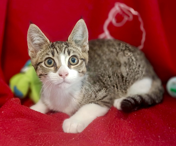 Meet Chip, a gorgeous tabby and white little gentleman with charm to spare. This sweet boy has a loving personality that shines through in everything he does. He's always ready for fun - whether it's chasing toys, pouncing on imaginary treasures, or playing games with the other kittens. Chip's playful spirit and curious nature make every day a little brighter.