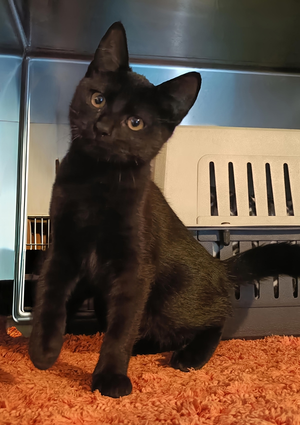 Cody is a handsome little black kitten with a sleek, shiny coat and a personality just as dazzling. This sweet boy is a total purr machine - the moment you pick him up or give him a gentle stroke, he switches on his motor and doesn't look back! He absolutely adores affection and will happily soak up all the cuddles you're willing to give.