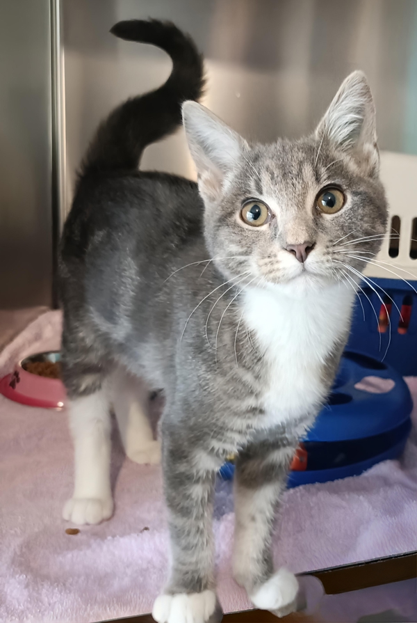 Everett is a gorgeous little silver tabby boy with striking white markings and a face that's almost too pretty to be real. This handsome kitten has a bright, happy personality and an easygoing nature that makes him a joy to be around. He's a tidy, calm little fellow who enjoys company but carries himself with a relaxed confidence - the kind of kitten who settles in quickly and makes himself right at home.