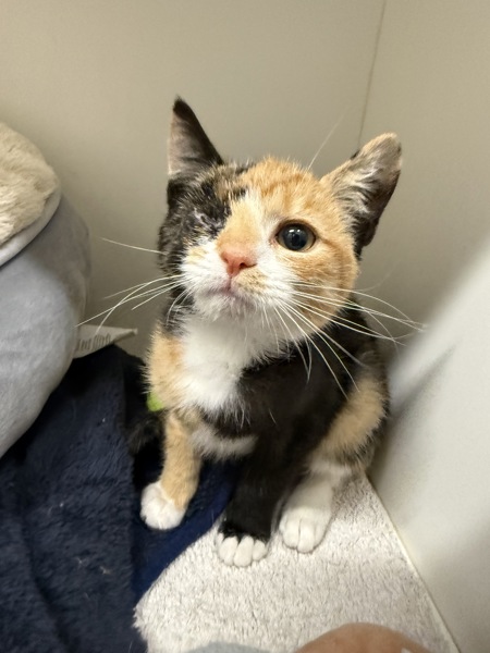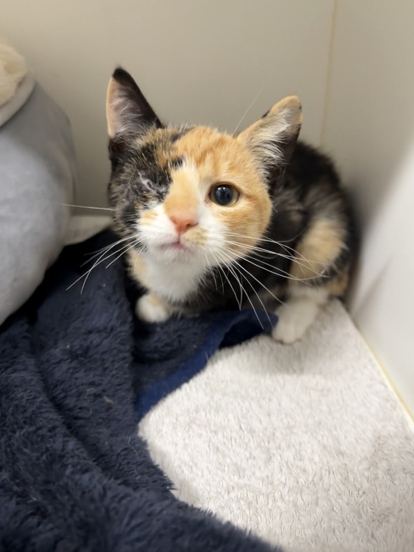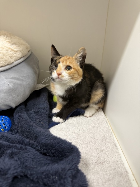 I'm a beautiful tri-coloured tortie with a one-of-a-kind look (and yes, I only have one eye-but that just means I see the world a little differently). At first, I like to take things slow. New places and new people can be a bit overwhelming, so you might find me tucked away in a cozy corner, quietly figuring things out.