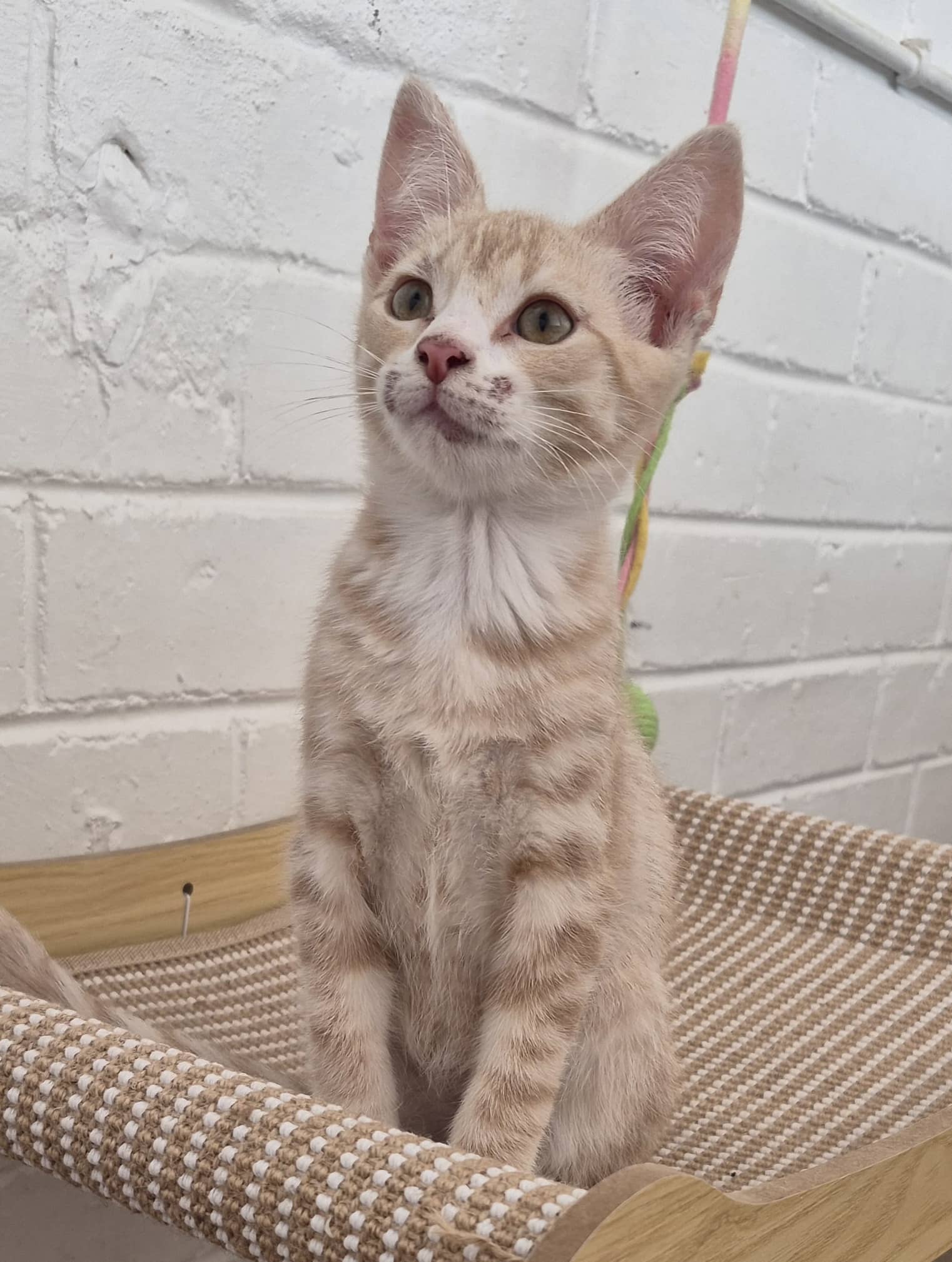 Hi, my name is Tigger and I am getting really brave with people. I can still hide sometimes if I'm frightened. I'm curious and i really want to know you and play games with you. I'll purr really loud when you give me scratches on my back and it's also okay for you to pick me up and give me cuddles when I'm not busy playing. I love chasing ribbons and playing with toys. When I know you really well, I'll talk to you when I see you and want your company. I love Dine creamy treats and this is a time to get to know me because I will sit on your lap while eating. I can't wait to find my forever home.