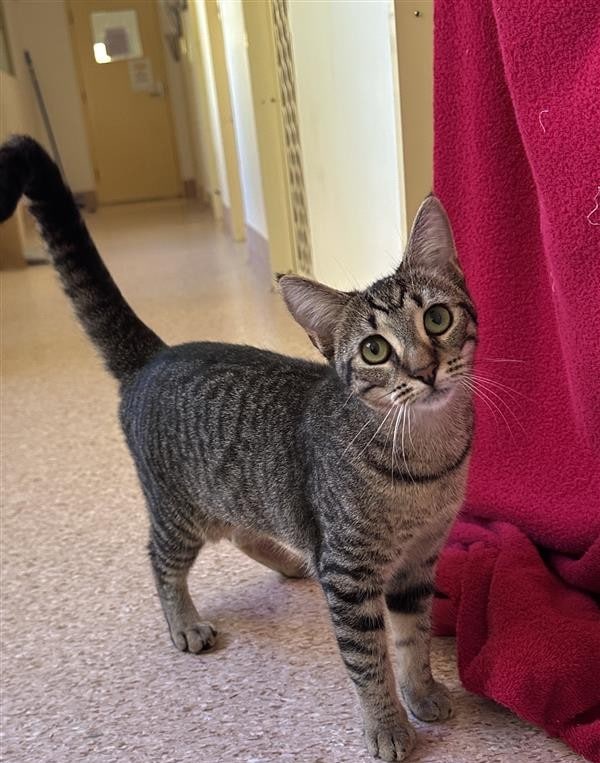 I’m still learning that people can be trusted, so I’m looking for a patient, Quiet/calm home that lets me move at my own pace. We are not used to touch or handling just yet, what I really need is a peaceful space where I can feel secure. Once I’m comfortable, I love chasing toys, pouncing on anything that moves, and exploring every corner like the curious kitten I am. I may not be a lap cat just yet, but my playful spirit and gentle presence make me a wonderful companion.