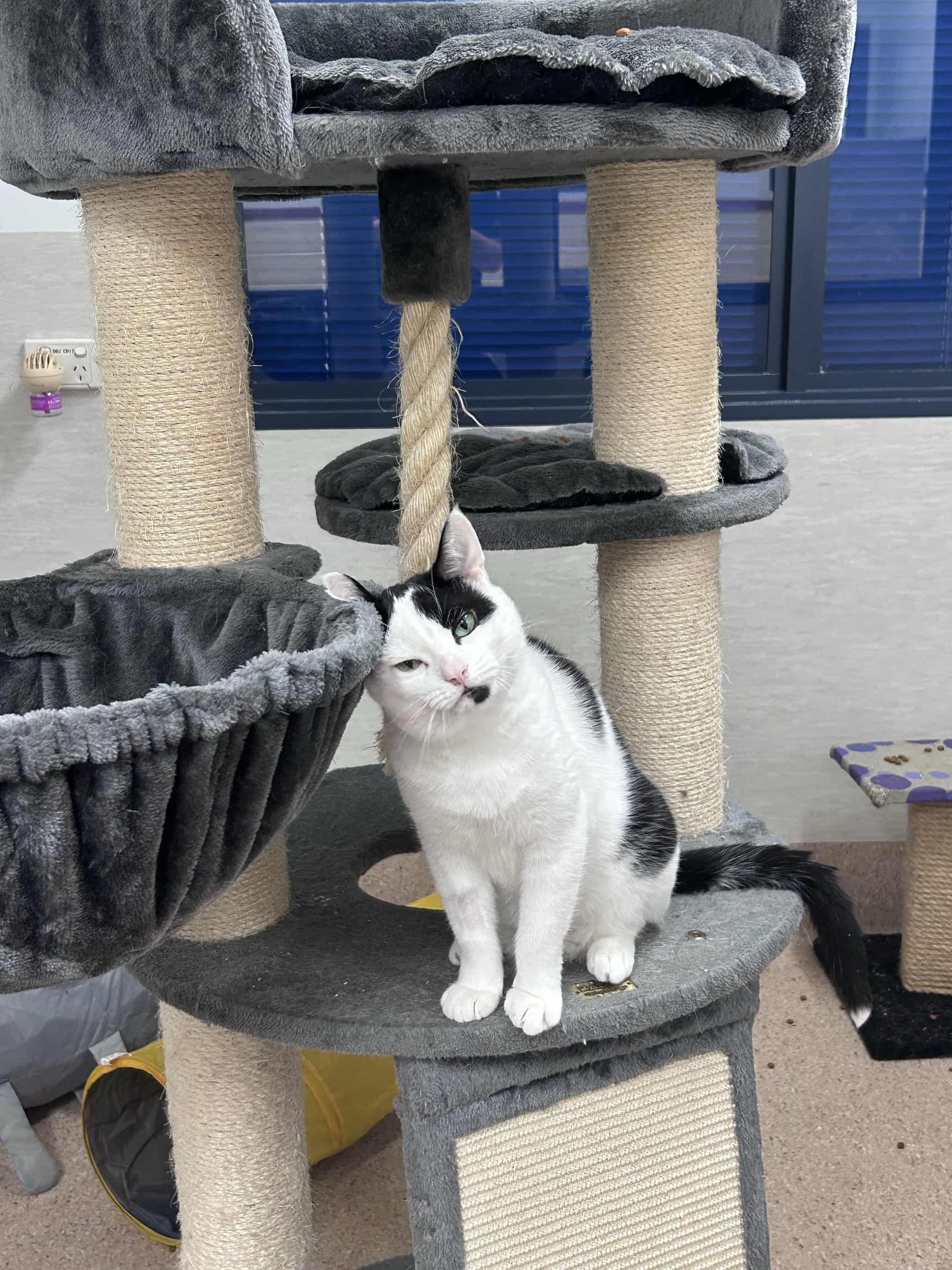 When it’s time to rest, Bailey prefers cozy, tucked-away spaces like cat hides and hammocks where he can relax and recharge.
