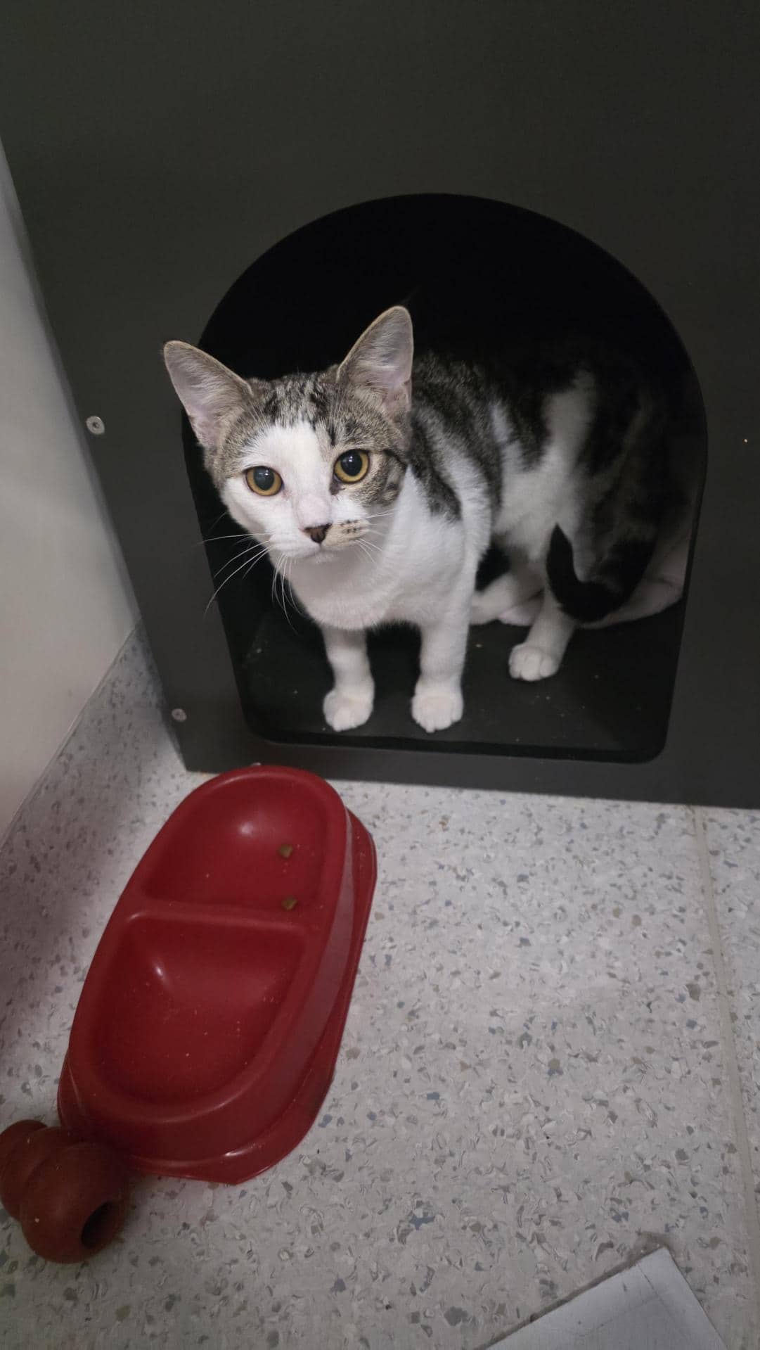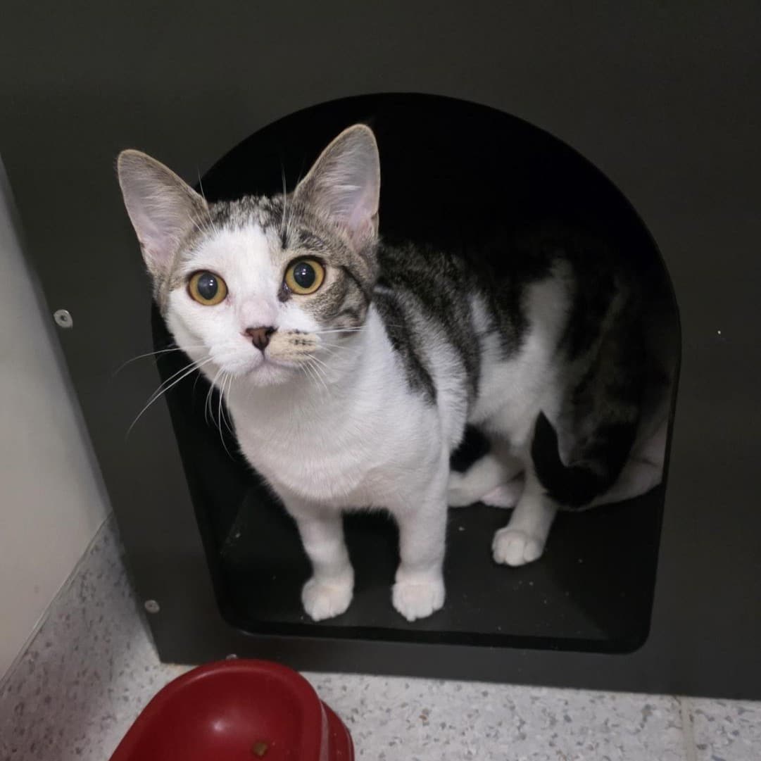 Hi, I’m Velma, a female Domestic Short Hair kitten. I’m about 4 months old. I’m energetic, curious, and I love to chase, pounce, and nap in cozy spots. I’m happiest in a lively home, but I do best with calm play and gentle routines. I get along best with children aged 6 and up, and I adore their kind attention. I need a quiet, calm household—peaceful spaces help me settle into a forever home. I’d enjoy soft toys, climbing shelves, and plenty of cuddles after play. I’m ready to grow into a loving companion and I can’t wait to meet you. If you want a curious cuddle buddy who will become a loyal friend, I’m your girl.