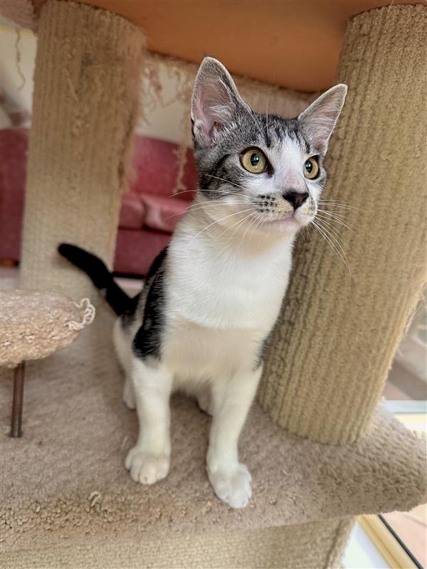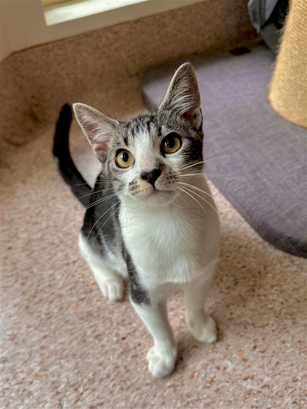 I’d suit a home that can meet my high play needs and enjoys an affectionate, lively cat who wants to be part of the daily routine. That being said, I would like a home with no children under 6, as I’m still learning and growing and need humans who can respect my boundaries. I’ll do best with people who understand I’m still a baby and won’t accidentally reinforce behaviours I’m working through as I learn how to navigate the world.